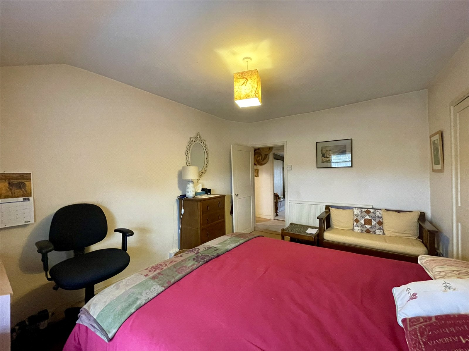 A lovely large partly timbered bedroom with cottage style window to the front elevation. Two wall light points. Double radiator. To the side of the chimneybreast sits a walk-in cupboard serving as a useful walk-in wardrobe complete with light, shelves and hanging rails.