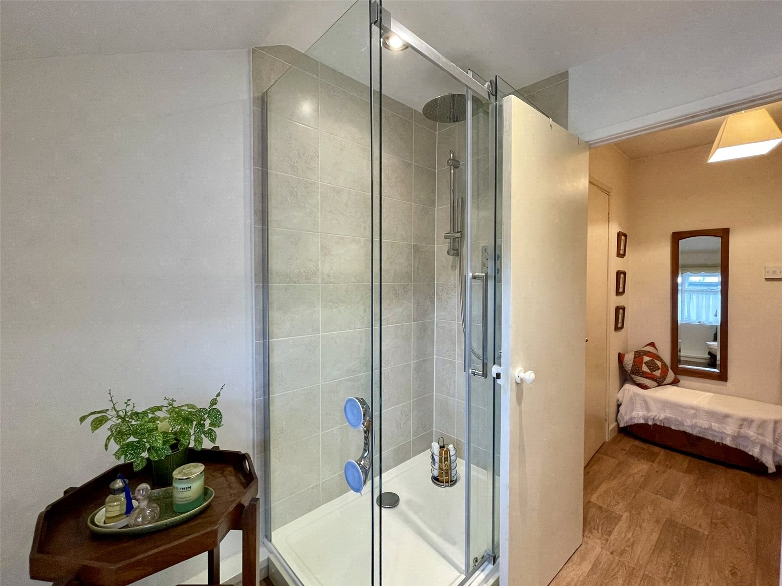 Smart in white and more recently updated to provide a well appointed space comprising vanity wash basin and low level wc set within fitted cabinet work providing storage and surface space. A walk-in 75x120 shower enclosure has monsoon shower head and hand held shower. Window to the rear. Stainless railed vertical radiator.