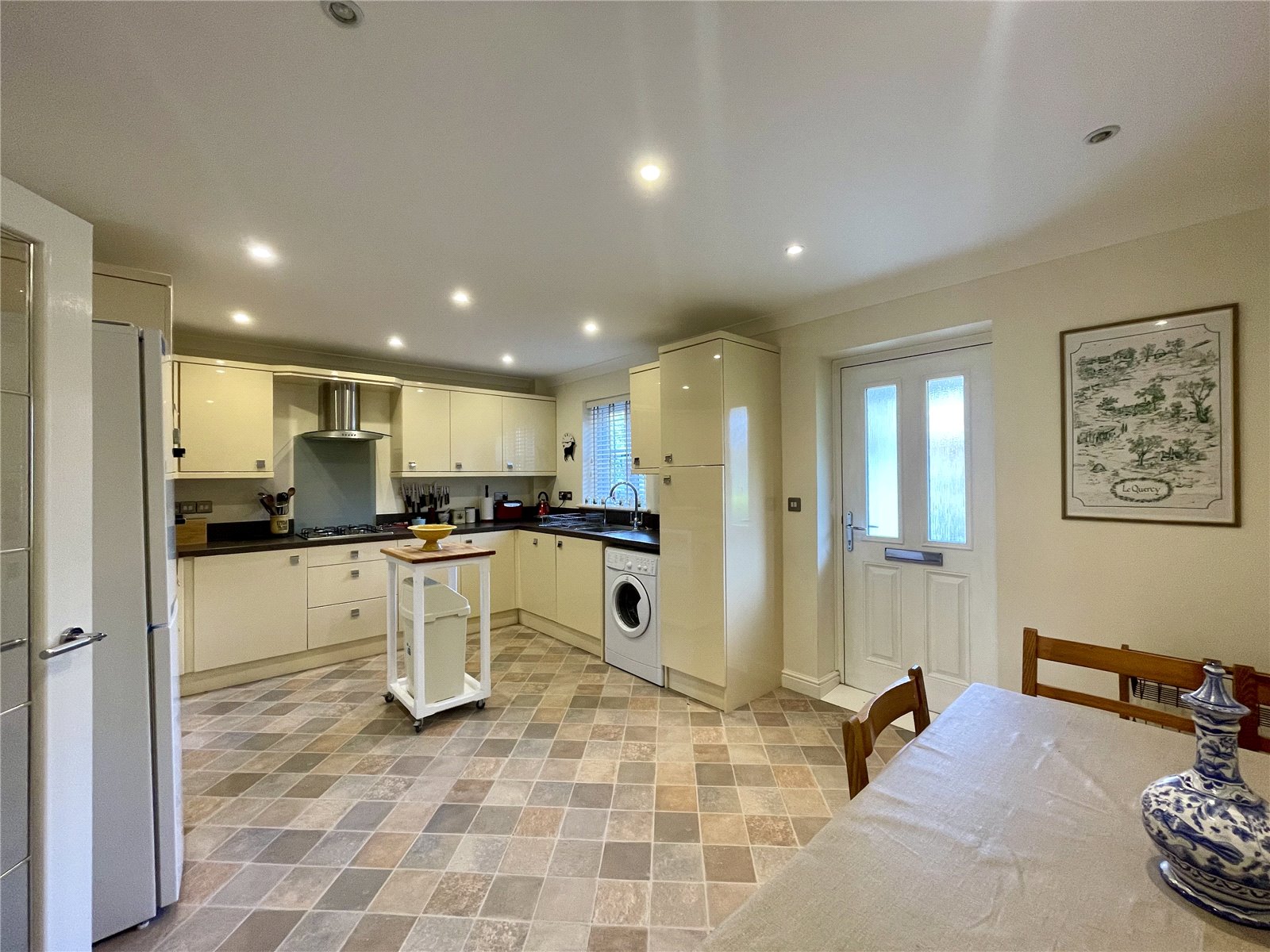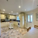 Well proportioned with ample table space and units set to one side around three walls. In a smart gloss finish the units provide extensive cupboard and drawer storage options along with wall cupboards to match complete with underlighting. Units include a Bosch double oven and grill, four ring gas hob with chimney hood above and Bosch dishwasher along with a built in washing machine. Stainless steel single drainer sink unit fitted with a water filter and separate drinking water tap. Recessed ceiling spotlights. Double radiator with Thermostatic Radiator Valve (TRV). Tiled floor. Coved ceiling. A panel glazed door leads through to the...