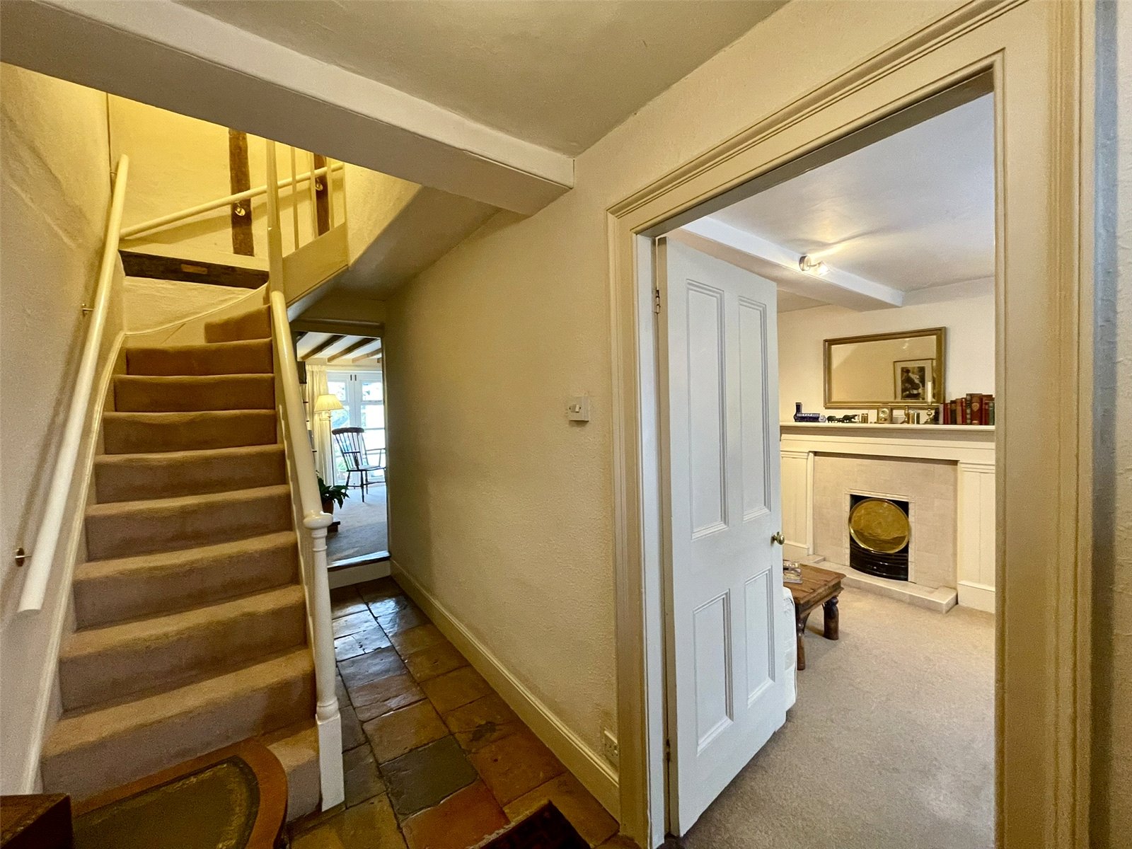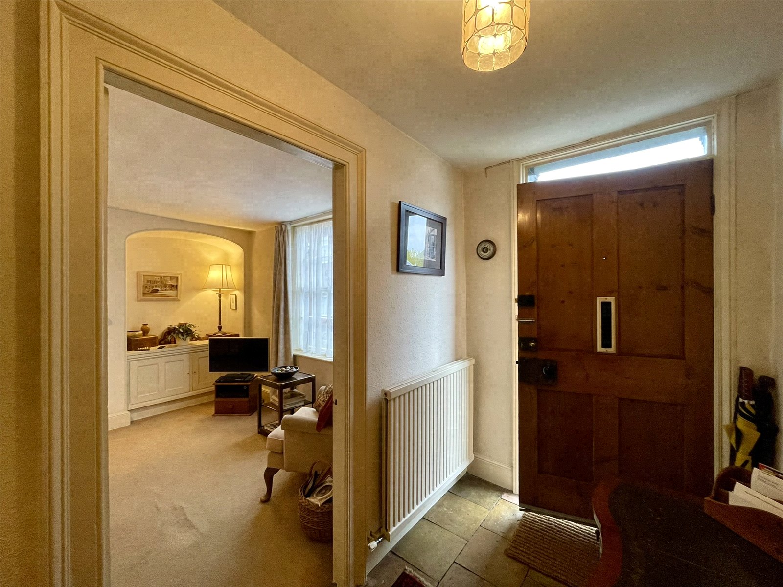 A welcoming, sizeable classic hallway approached via a traditional panelled outer door within a Georgian style doorcase with hoods on pilasters. Steps lead up from the street pavement. A pamment tiled floor has been retained throughout and a Georgian style staircase with attractive period newel posts rises to the first floor. The hallway is also notable for the panelled internal doors, door furniture and hinges, the door through to the rear having two glazed panels. Understairs cupboard. Double radiator.