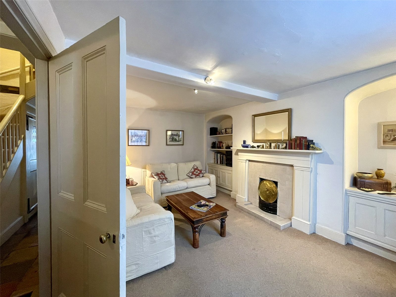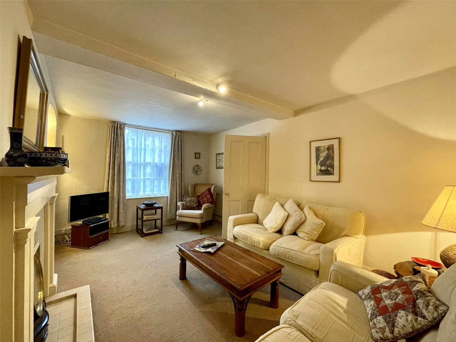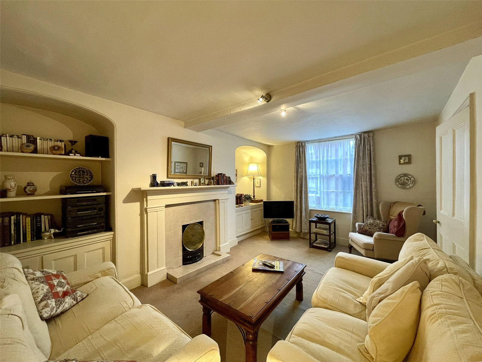 Featuring a classic chimney breast and fireplace with painted chimneypiece along with alcoves either side fitted with a combination of cupboard storage and shelving. A 6/6 sash window provides natural light from the front elevation. Double and single radiators. Dimmer switch. Television socket etc. Good ceiling height as with most of the interior of 7'5 (2.28m) within this room.
