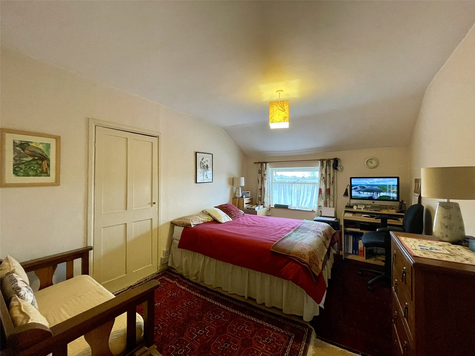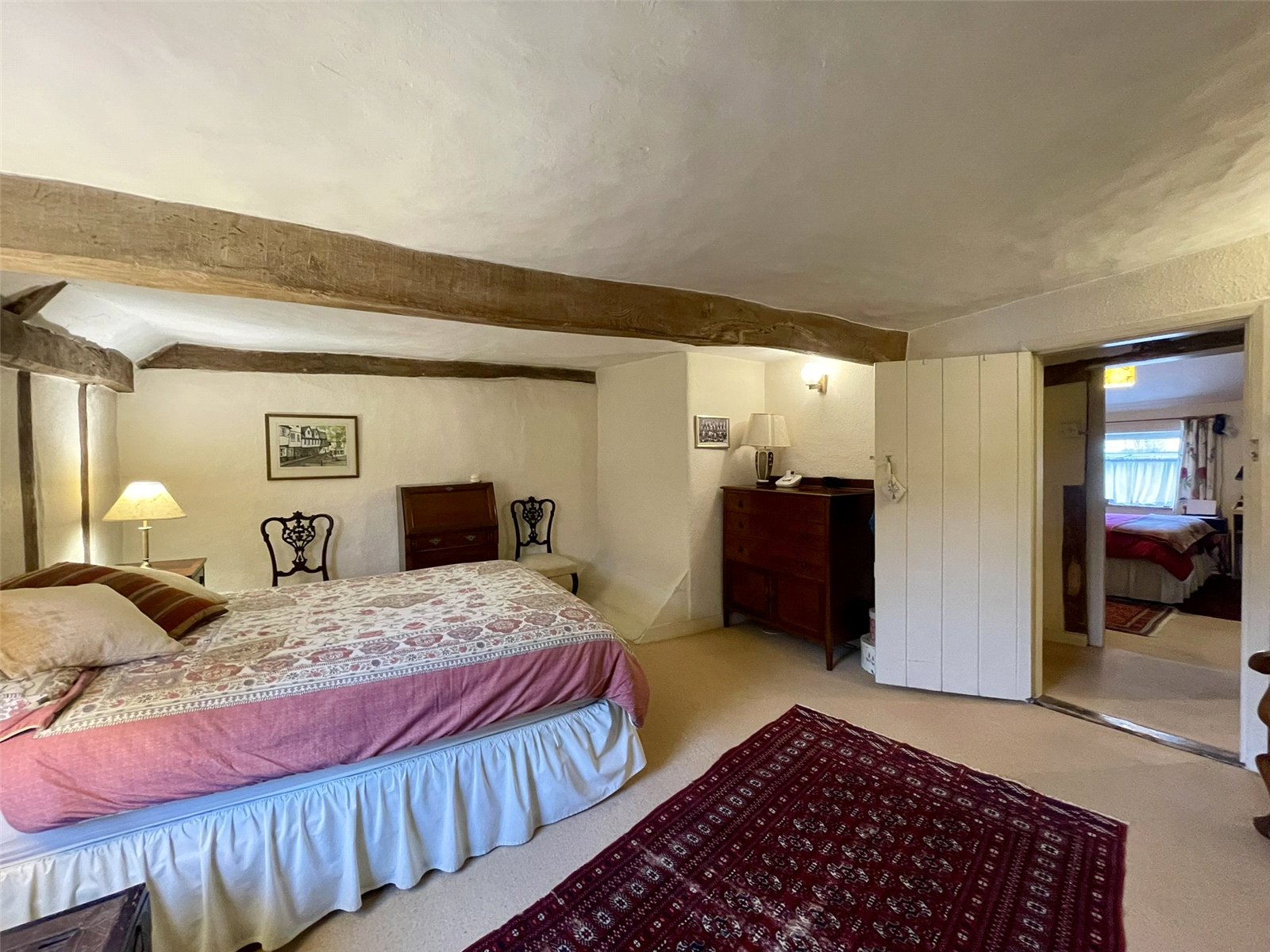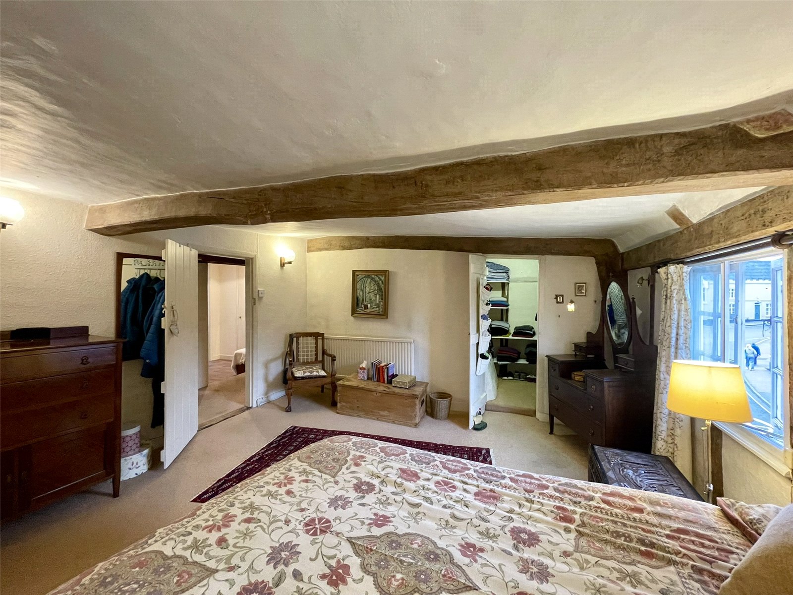 A lovely large partly timbered bedroom with cottage style window to the front elevation. Two wall light points. Double radiator. To the side of the chimneybreast sits a walk-in cupboard serving as a useful walk-in wardrobe complete with light, shelves and hanging rails.