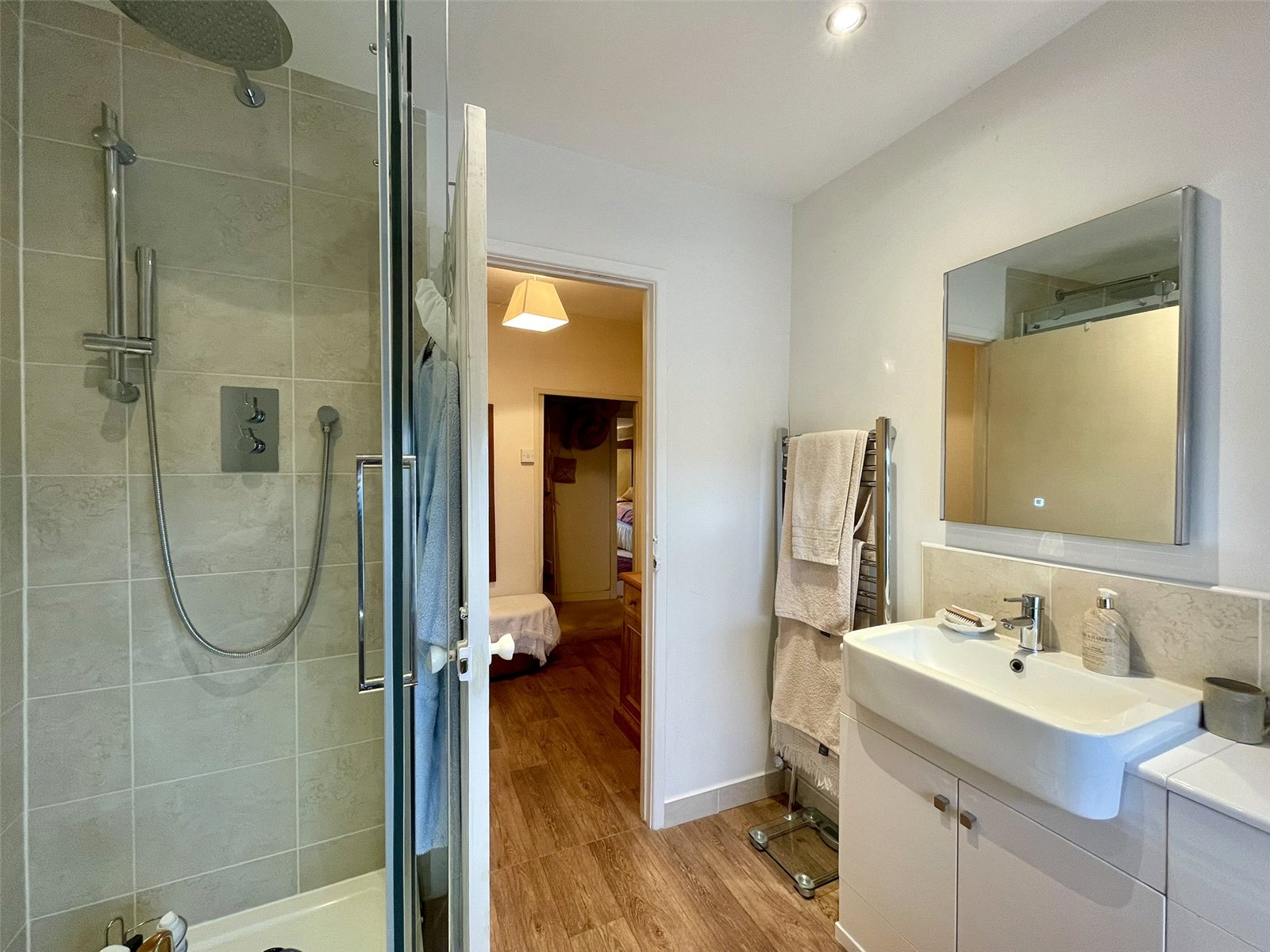 Smart in white and more recently updated to provide a well appointed space comprising vanity wash basin and low level wc set within fitted cabinet work providing storage and surface space. A walk-in 75x120 shower enclosure has monsoon shower head and hand held shower. Window to the rear. Stainless railed vertical radiator.