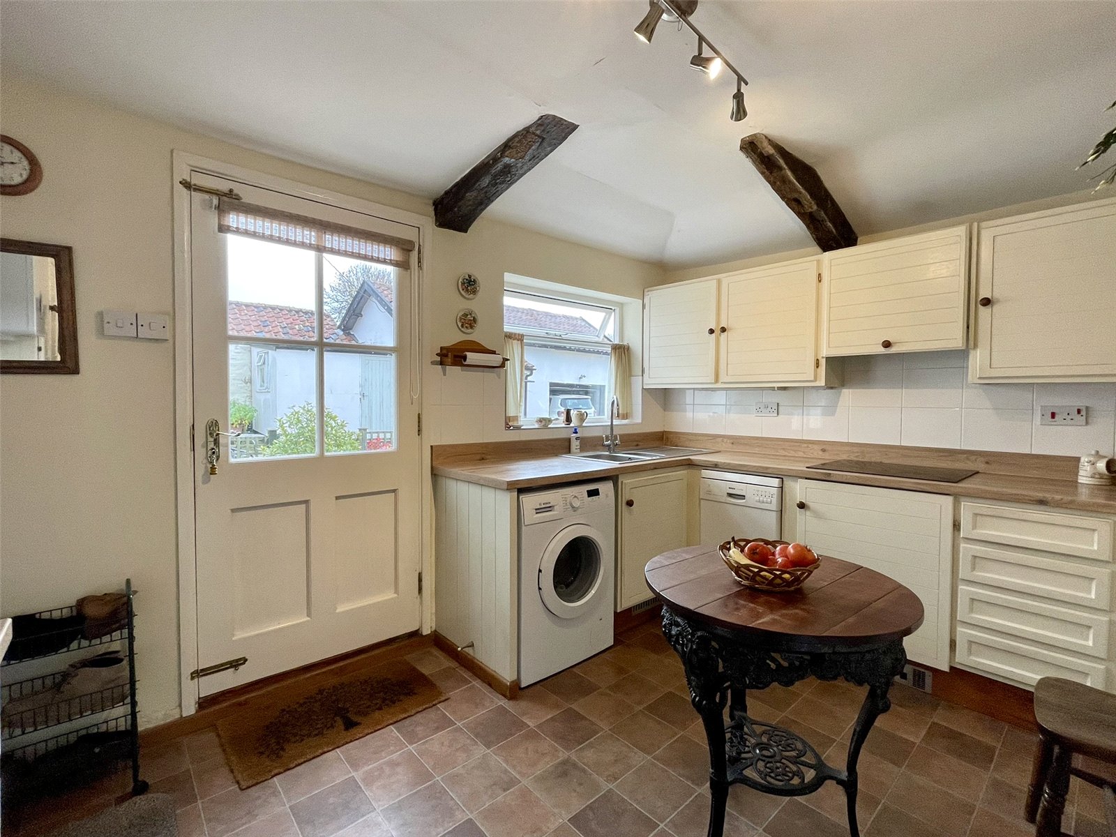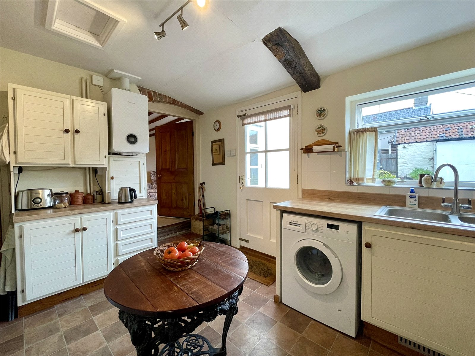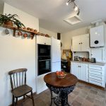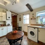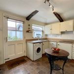Light and bright with glazed window and part glazed panelled outer door. Fitted units provide a mix of storage with both cupboards and drawers along with woodgrain effect worktop incorporating a stainless steel single drainer sink unit with drainer bowl and mixer tap. Neff built-in hob with extractor hood above. Neff eye level double oven with microwave function. Upright fridge freezer space. Plumbing for slimline dishwasher. Plumbing for washing machine. Wall cupboards. Kickspace heater. Worcester gas fired boiler supplying domestic hot water and radiators. Access to single storey roof space. A stripped period door in one corner provides access to the Cellar.