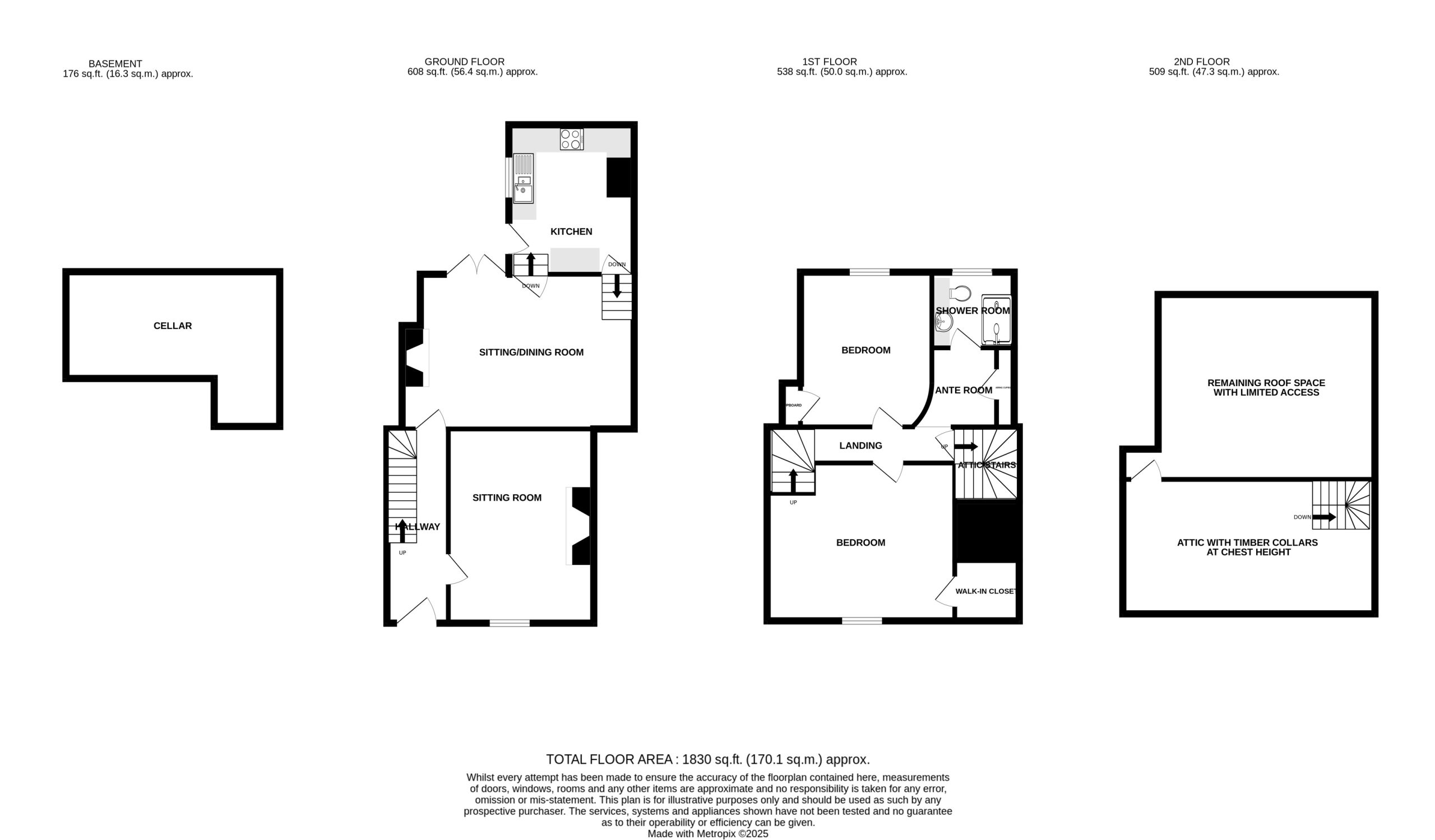 The straight stairs turn at the very top to a landing extending across the width of the house. To the far end a latch door opens to a further flight of stairs providing access to the Attic.
