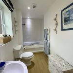 Fitted with a suite comprising pedestal wash basin, low level wc and tiled shower enclosure. Single radiator with thermostatic valve. Built-in airing cupboard with pressurised hot water tank and immersion heater. Window to the rear elevation. Recessed spots.
