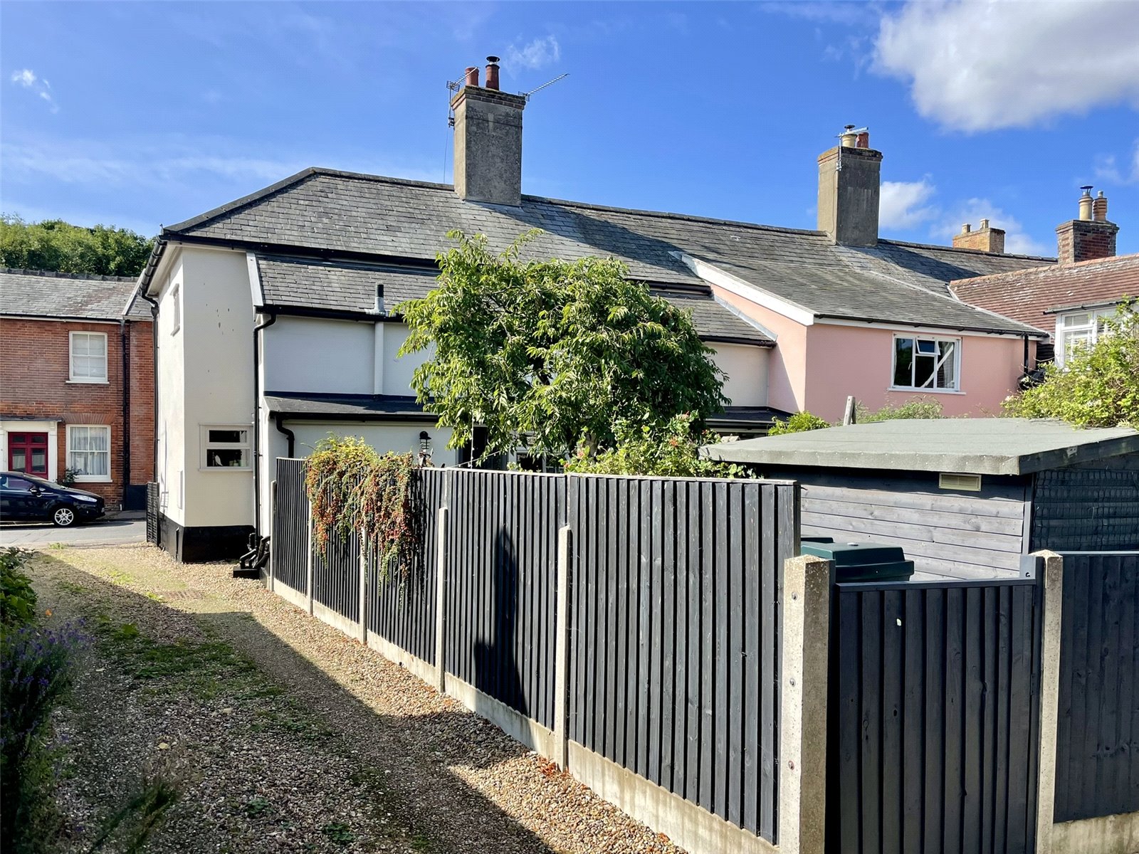 47-49 Church Street until 2015 had been separate properties under a single ownership of many years standing. Upon death the properties were sold at Public Auction with both finding new owners. It was in 2016, with works well underway at No.47 the owners took the opportunity to acquire No. 49 from their fellow Auction buyer who himself had just completed his own programme of works next door. As a result the two properties have been combined and they really do work well together. Listed as being of Architectural and Historic Interest Grade II, the Georgian appearance of the front belies a timbered interior of great character. The owners have by bringing both cottages together formed a handsome front elevation with reception room spaces either side of the now central chimney stack. The long room across the rear of the ground floor is lovely and full of character being beamed and laid with pamment tiles. It links the sitting room to the dining room which contains kitchen space along with workstation through open studwork beyond. Upstairs the central staircase, retained from No.47, rises to a landing serving all four rooms and bathroom. The principle bedroom not only offers a walk-in closet alongside the chimney but also a room to the rear forming a perfect dressing room. Conveniently, this space connects back to the landing creating a circular flow. Outside, the two garden spaces now form a super backdrop for a town property and one worthy of featuring in the annual Eye Open Gardens weekend. A verandah and decking create a sheltered spot to sit and enjoy the prettily planted space where a Summerhouse acts as a bolt-hole from the cottage. Importantly, the driveway at the side leads to two car parking spaces provided to the property by the Title of No.41-43 Church Street.