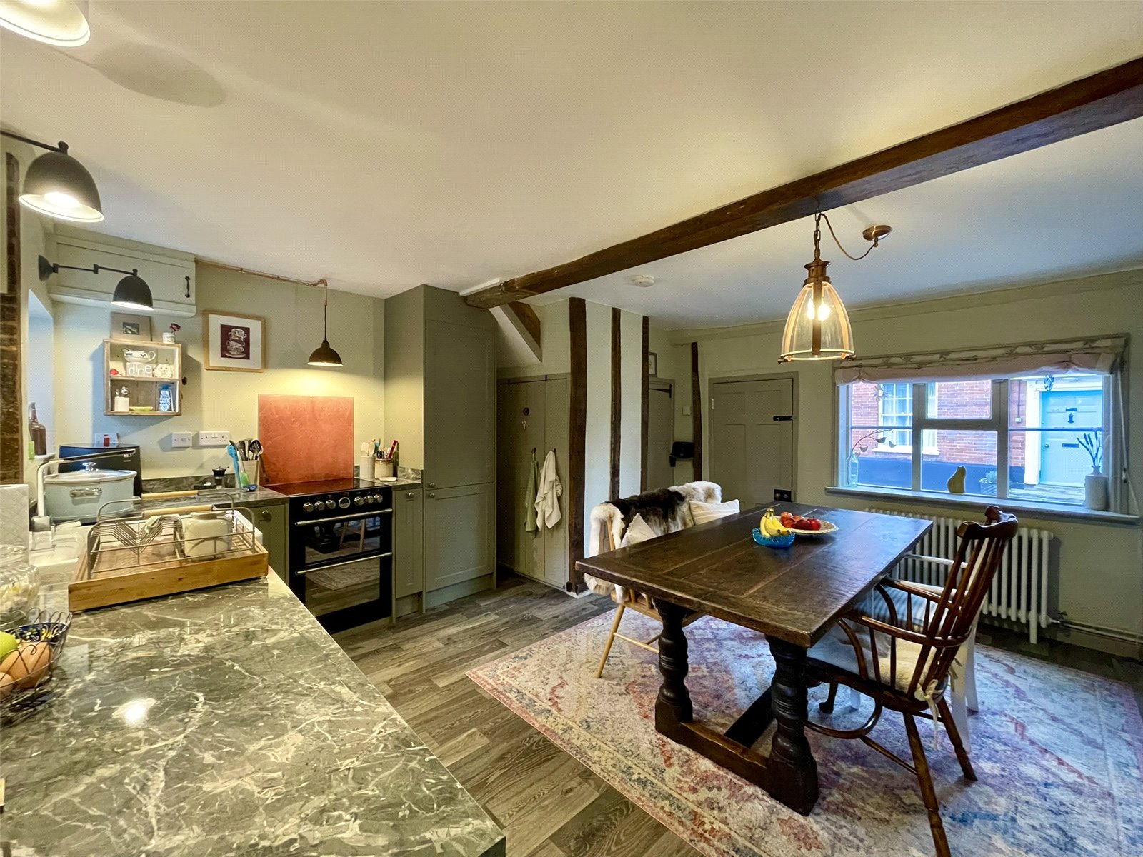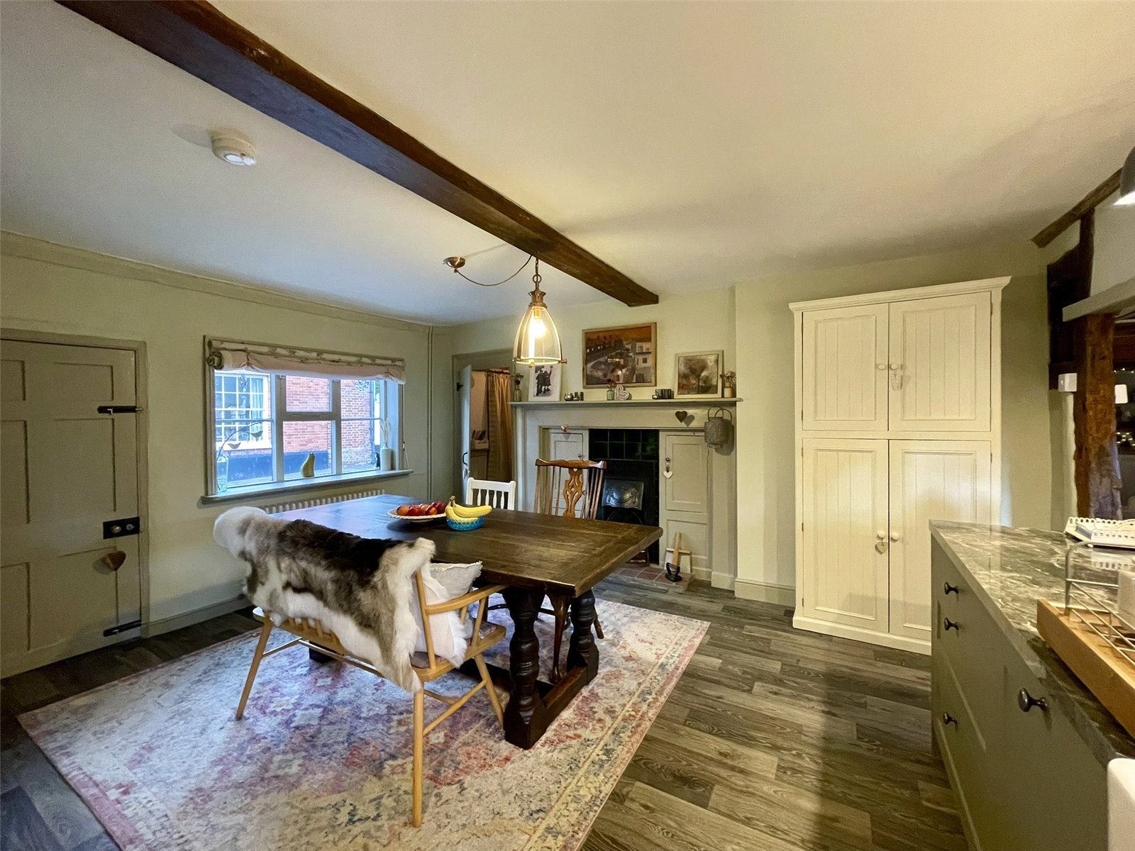 Full of character with exposed timbers and brickwork, character doors including a stable door plus cottagey windows. A pamment floor extends throughout complementing the timbers and brickwork. A cast style radiator is set alongside. To one end a Kitchen workstation links through the open studwork and serves as a preparation area. Two wall lights combine with two pendant fittings. Overall a versatile space but a cosy sitting space ideal for a favourite armchair, good book and a whiskey tumbler.