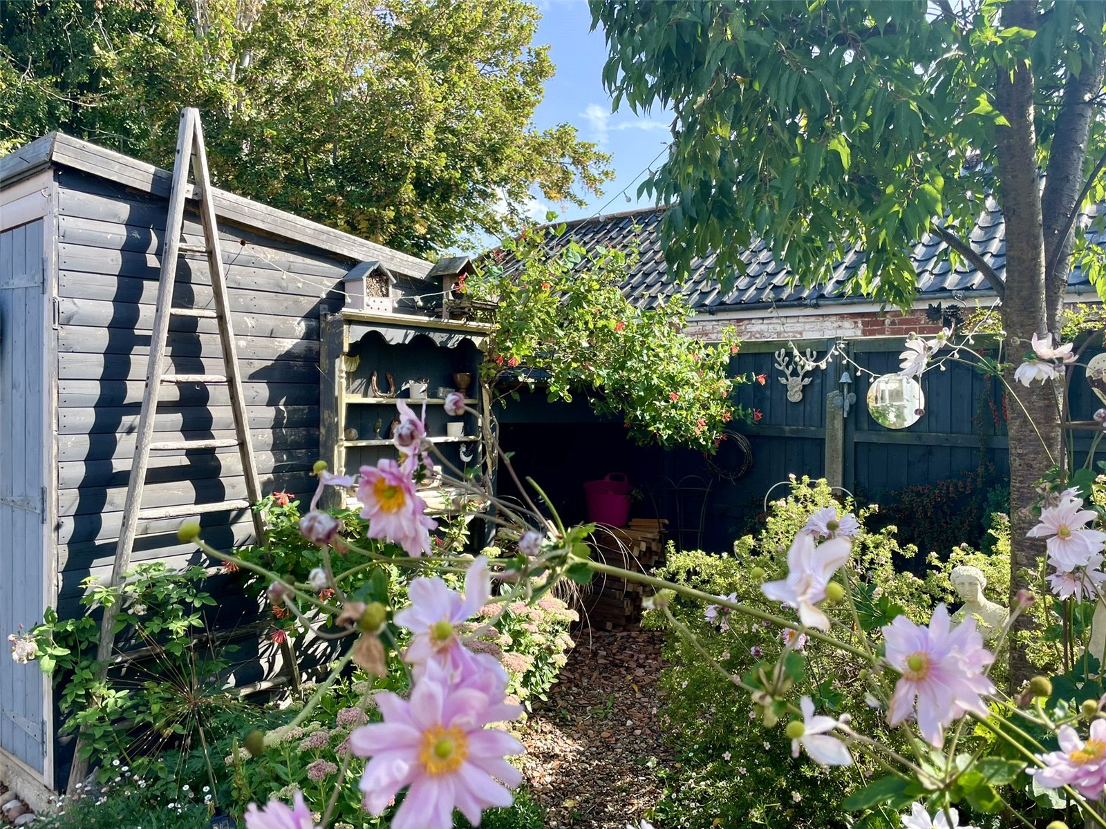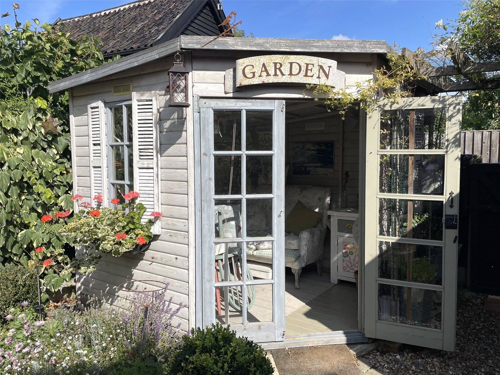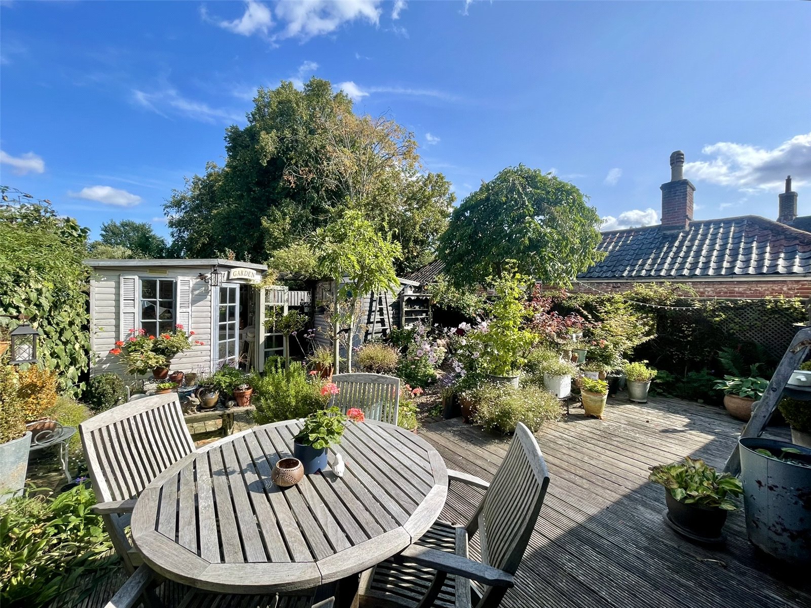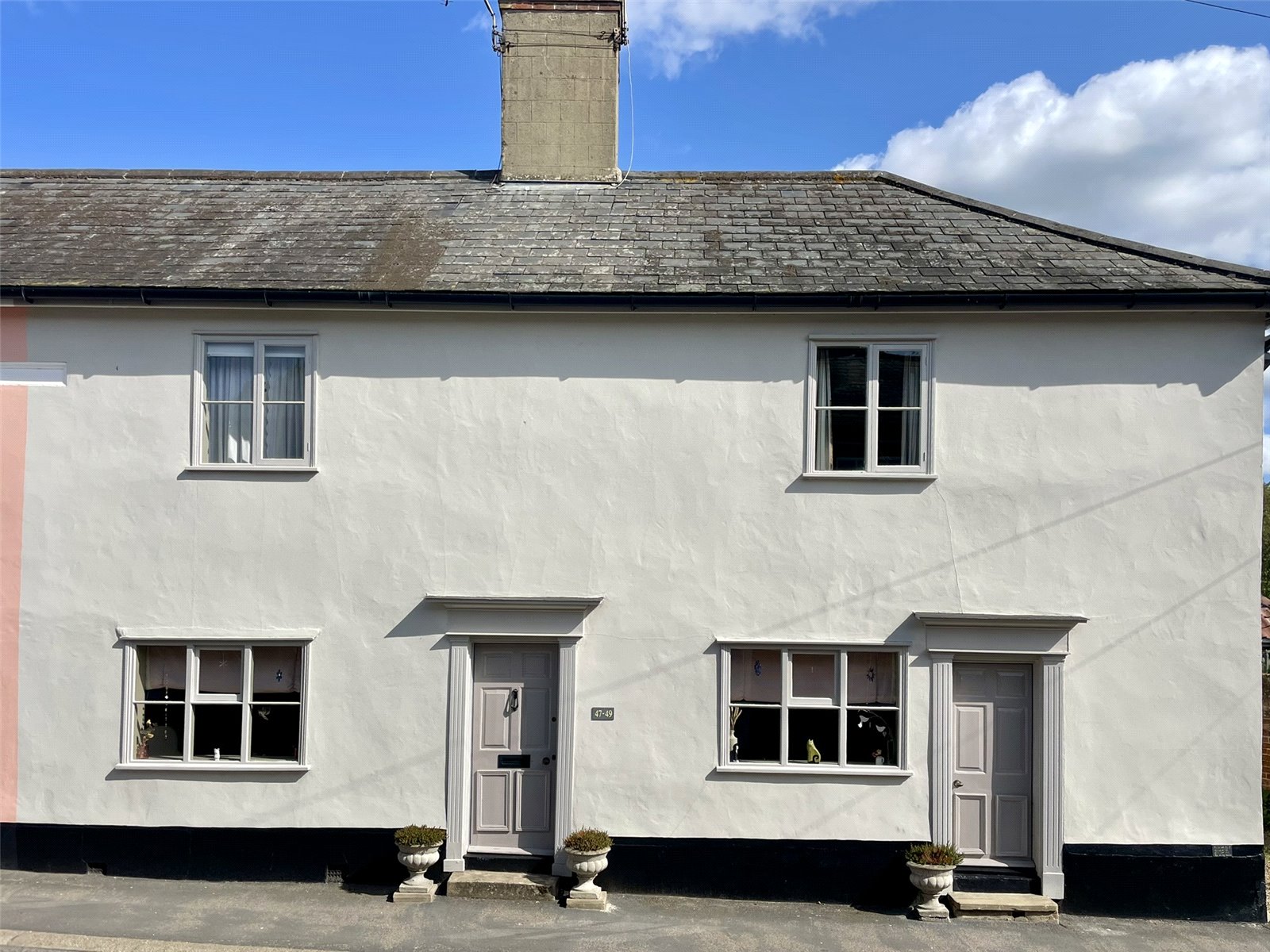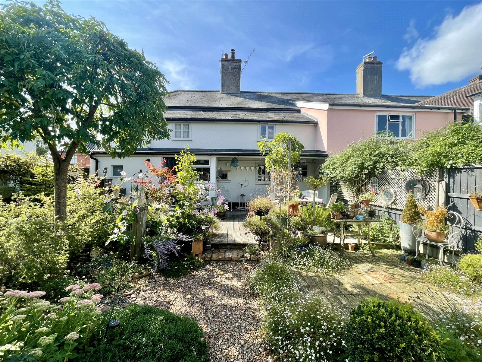 47-49 Church Street until 2015 had been separate properties under a single ownership of many years standing. Upon death the properties were sold at Public Auction with both finding new owners. It was in 2016, with works well underway at No.47 the owners took the opportunity to acquire No. 49 from their fellow Auction buyer who himself had just completed his own programme of works next door. As a result the two properties have been combined and they really do work well together. Listed as being of Architectural and Historic Interest Grade II, the Georgian appearance of the front belies a timbered interior of great character. The owners have by bringing both cottages together formed a handsome front elevation with reception room spaces either side of the now central chimney stack. The long room across the rear of the ground floor is lovely and full of character being beamed and laid with pamment tiles. It links the sitting room to the dining room which contains kitchen space along with workstation through open studwork beyond. Upstairs the central staircase, retained from No.47, rises to a landing serving all four rooms and bathroom. The principle bedroom not only offers a walk-in closet alongside the chimney but also a room to the rear forming a perfect dressing room. Conveniently, this space connects back to the landing creating a circular flow. Outside, the two garden spaces now form a super backdrop for a town property and one worthy of featuring in the annual Eye Open Gardens weekend. A verandah and decking create a sheltered spot to sit and enjoy the prettily planted space where a Summerhouse acts as a bolt-hole from the cottage. Importantly, the driveway at the side leads to two car parking spaces provided to the property by the Title of No.41-43 Church Street.