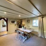 An inviting space featuring an inglenook fireplace complete with Charnwood wood burning stove set on a brick hearth along with a recess to one side. An attractive large window provides a view down the courtyard garden towards the barn at the rear. Double radiator with thermostatic radiator valve. A lobby to one corner leads through to the Dining Room and has a shelved built-in cupboard extending beneath the staircase. Ceiling height: 6'10 approximately.