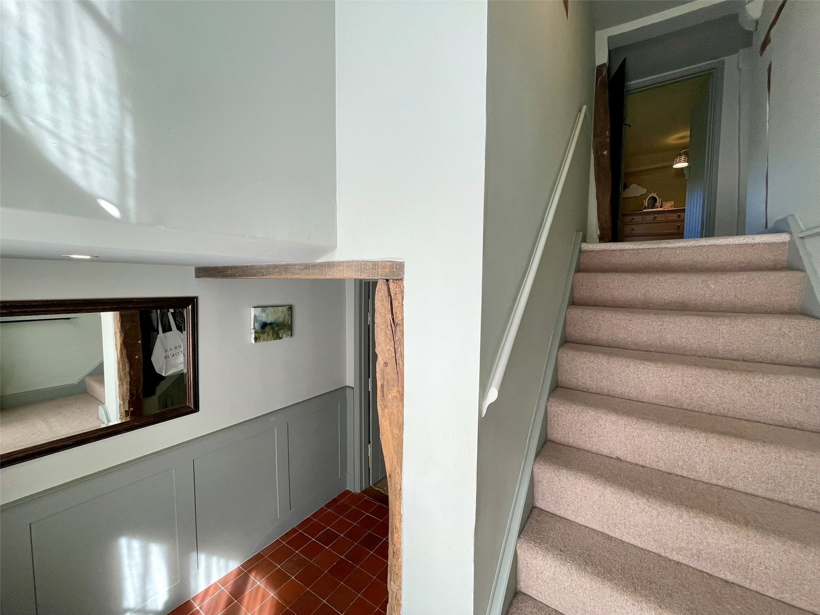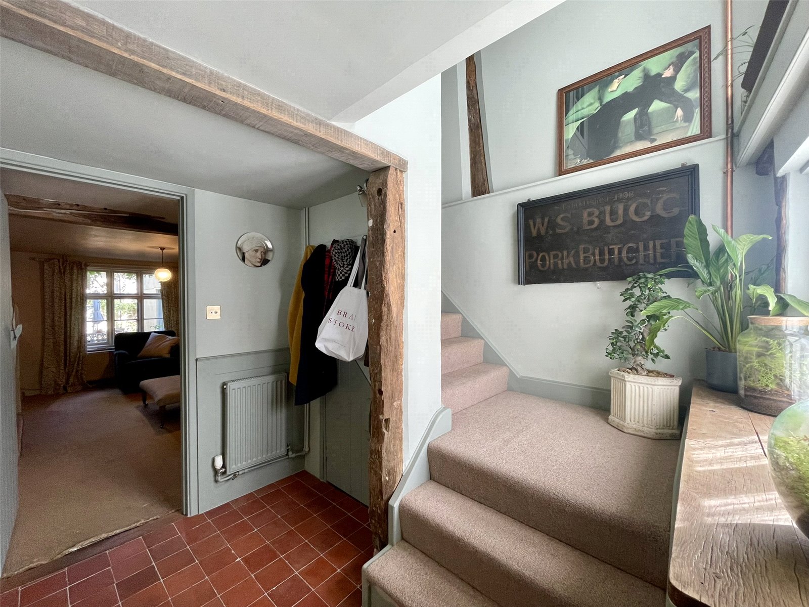 Enter via a panelled outer door opening to a surprisingly roomy initial space laid with a lovely reclaimed quarry tile floor. The stairs are to one side and the front window and upper first floor window provide excellent natural light. A number of original timbers are evident confirming origins of an older timber framed structure behind the later brick facade. Single radiator. Understairs cupboard. A latch door leads through to ...