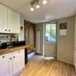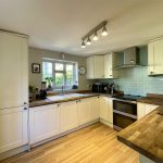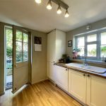 Fitted around three walls with an attractive range of units in a cream finish combined with woodblock work top. Cupboard and drawer storage units both wall and floor mounted include integrated washing machine along with fridge and freezer. An electric cooker slot has chimney hood above. Single drainer ceramic sink unit with drainer bowl and mixer tap. Wall cupboards include under lighting setting off smart ceramic tiling in stylish brick pattern in duck egg blue. Vertical wall mounted radiator with thermostatic radiator valve. A window provides an outlook to the courtyard and a part glazed door leads outside.