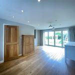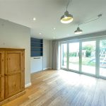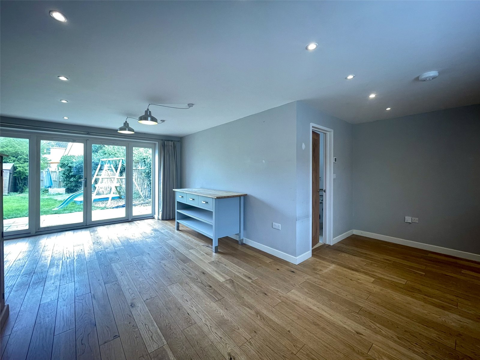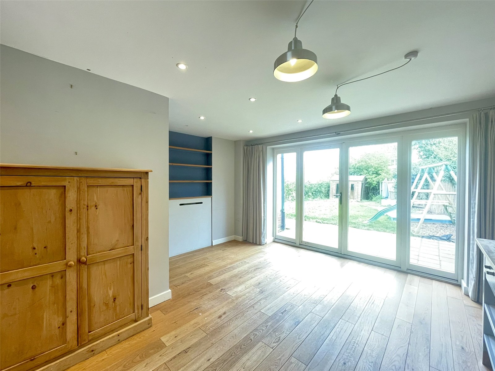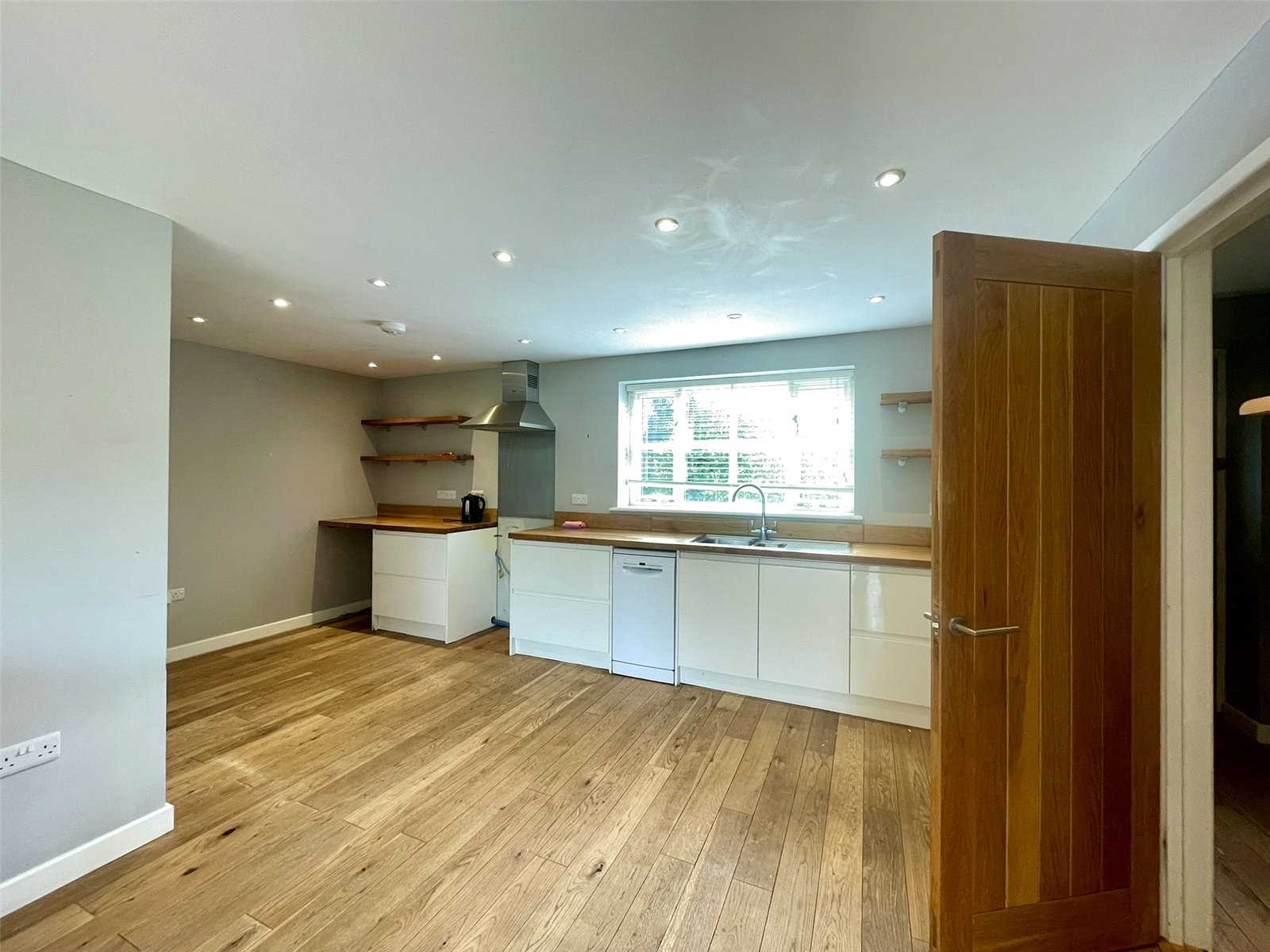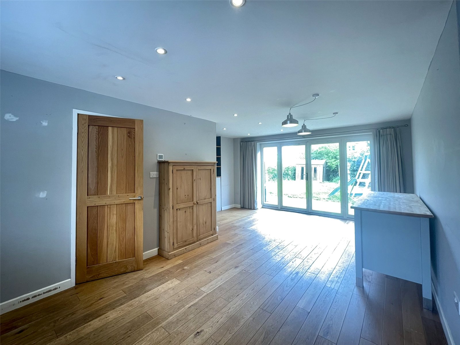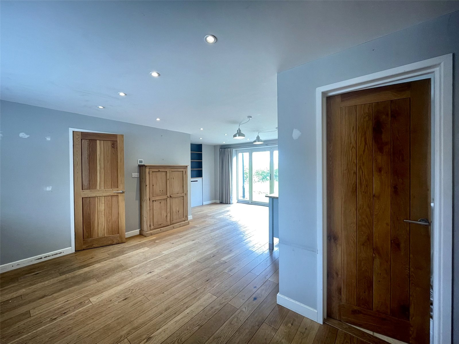 plus 14'4 x 12'9 (4.37m x 3.9m) A lovely sized social kitchen dining space with a central core and extensions either side. The oak boards continue through and add to the overall character and kitchen units in their sleek gloss finish set beneath wood block worktop. Storage options include a mix of cupboards and drawers, plumbing for dishwasher, stainless steel single drainer sink unit with drainer bowl and mixer tap. Electric cooker point with chimney hood above and splashback behind. A wide 4-pane window provides good southerly natural light and outlook to the front. To the rear of the space the room widens to include a further shelved recess and four glazed panels including a door to the rear garden.