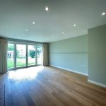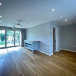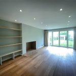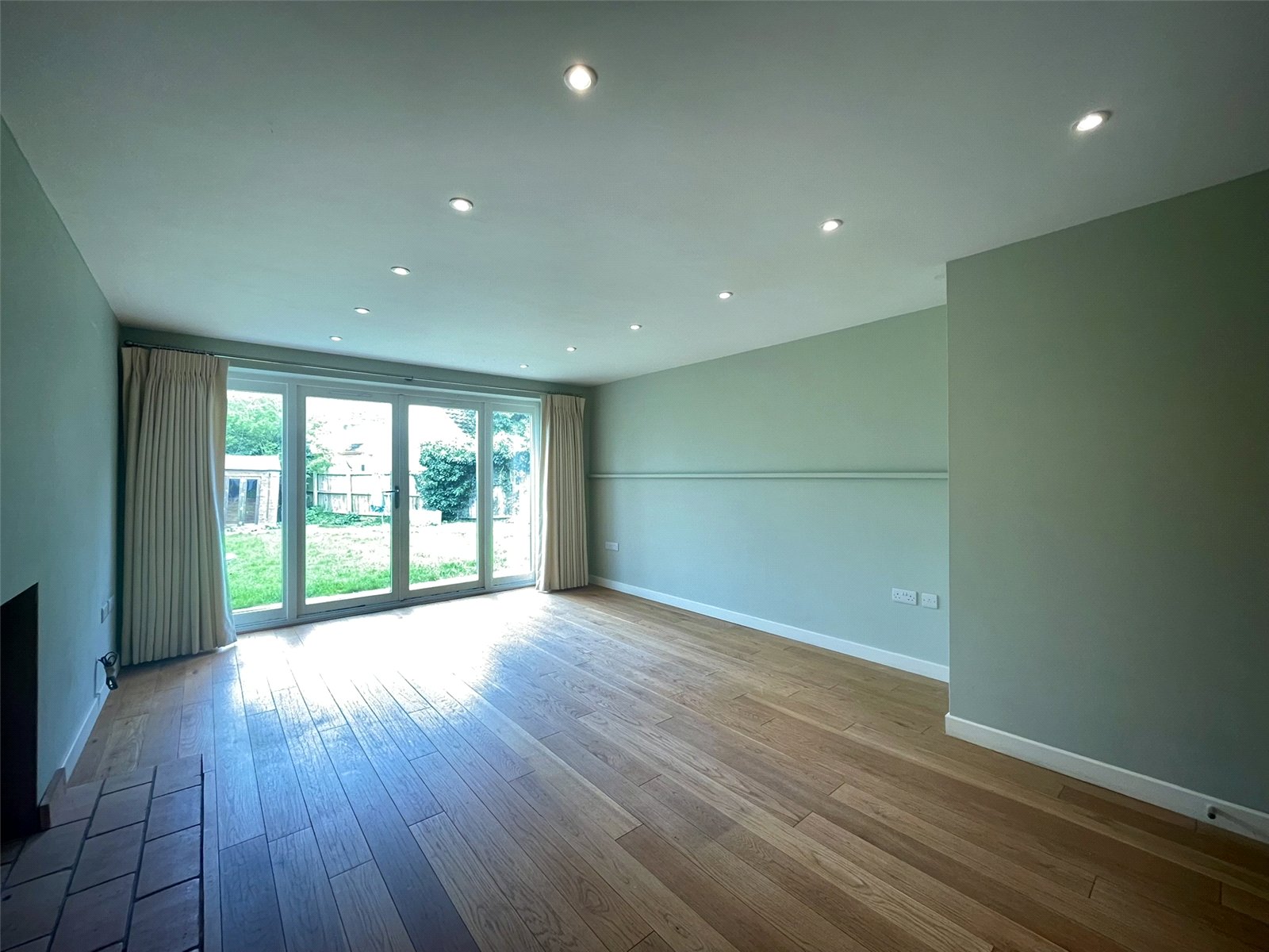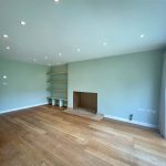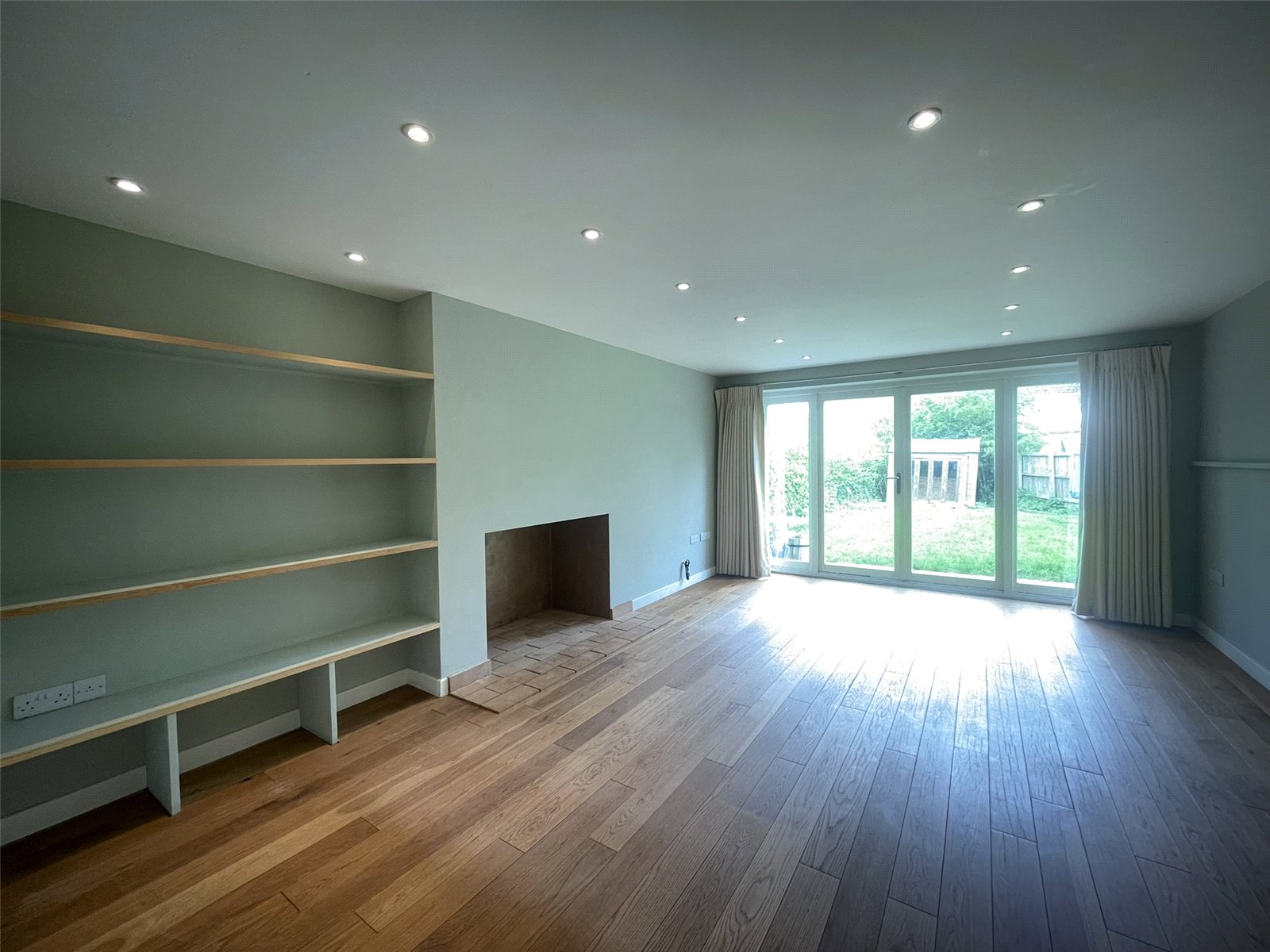 plus a versatile shelved recess alongside the chimneybreast. The fireplace was constructed with a woodburner in mind and to date has been unused. A dedicated table lamp lighting circuit is installed. Oak boards extend from the hallway throughout this good size reception room which has French doors leading out to the garden. Television and telephone points. Recessed ceiling spotlights.