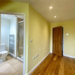 Featuring travertine tiling, double shower enclosure, low level wc and vanity wash basin. Vertical heated railed towel rail. Velux window.