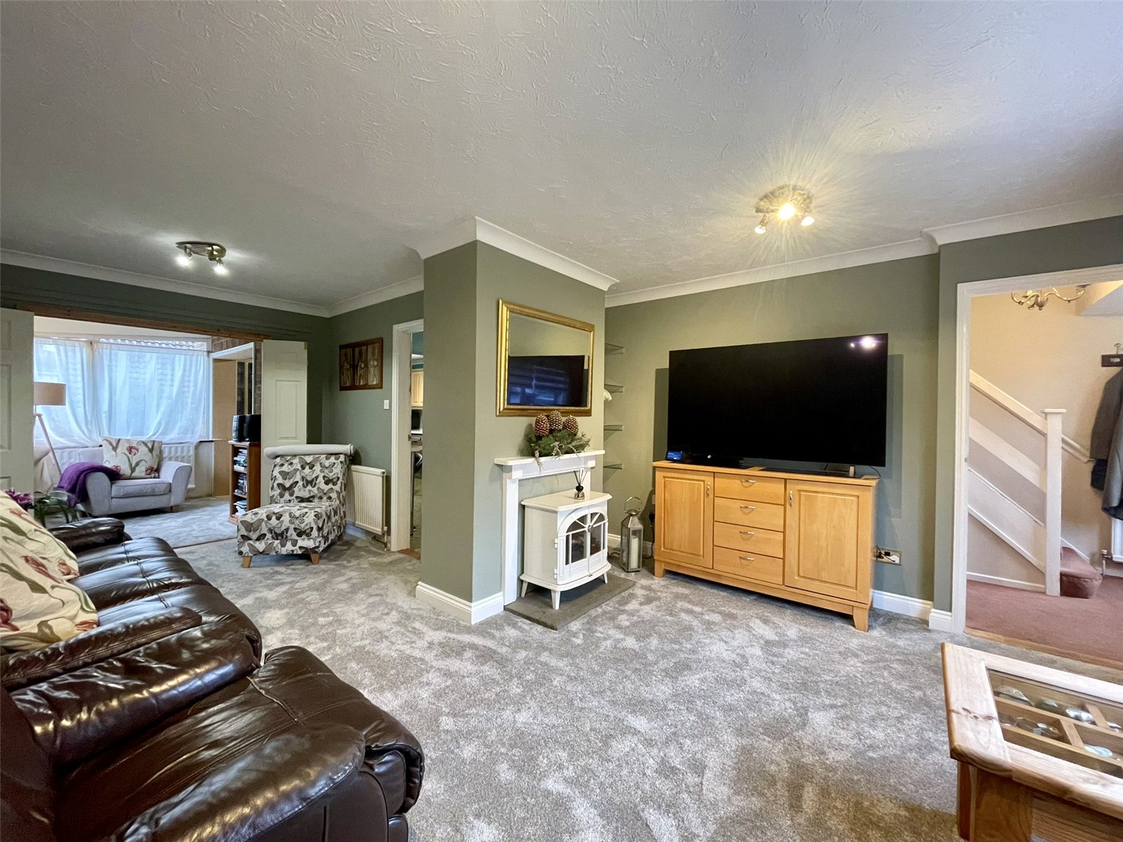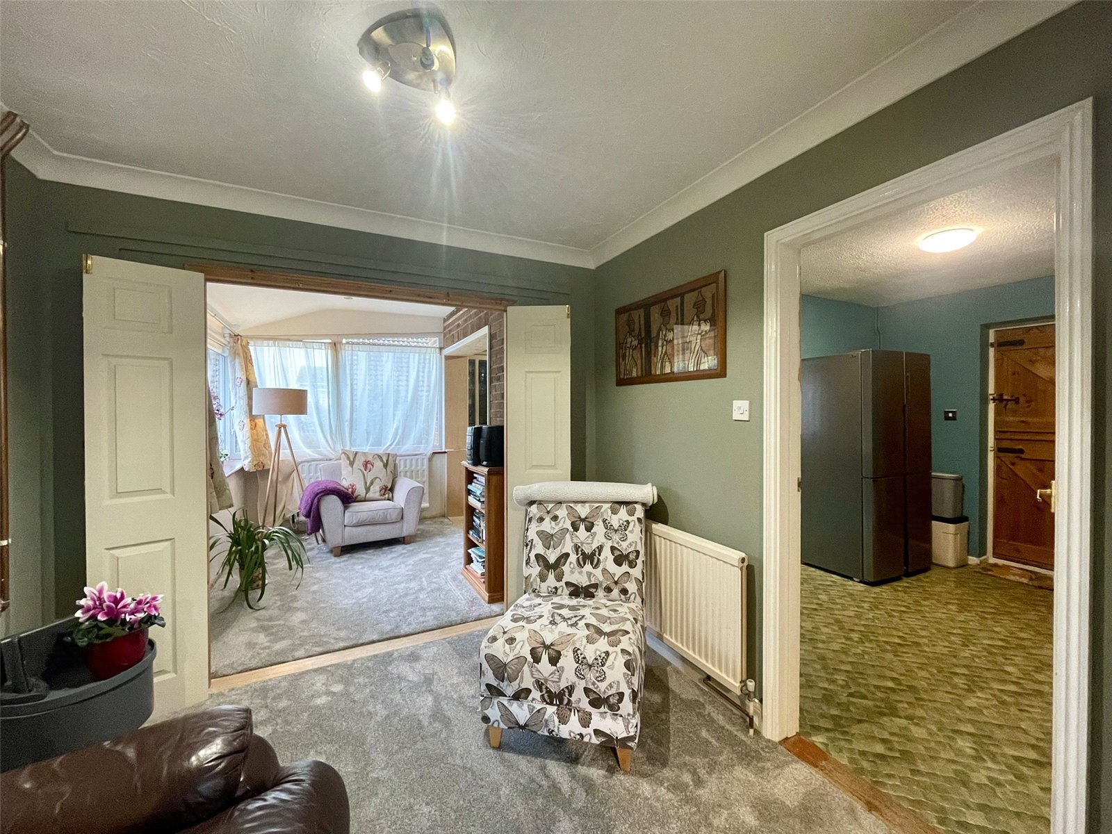 Measured at its widest point, narrowing towards the rear as illustrated by the floorplan. A picture window provides an outlook to the front and a painted chimneypiece and hearth creates a focal point of the central chimneybreast. Double bi-fold doors lead through to the Garden Room along with an additional door leading through to the Dining Room. Together, the spaces combine to create a circular flow between them. 2 double radiators.