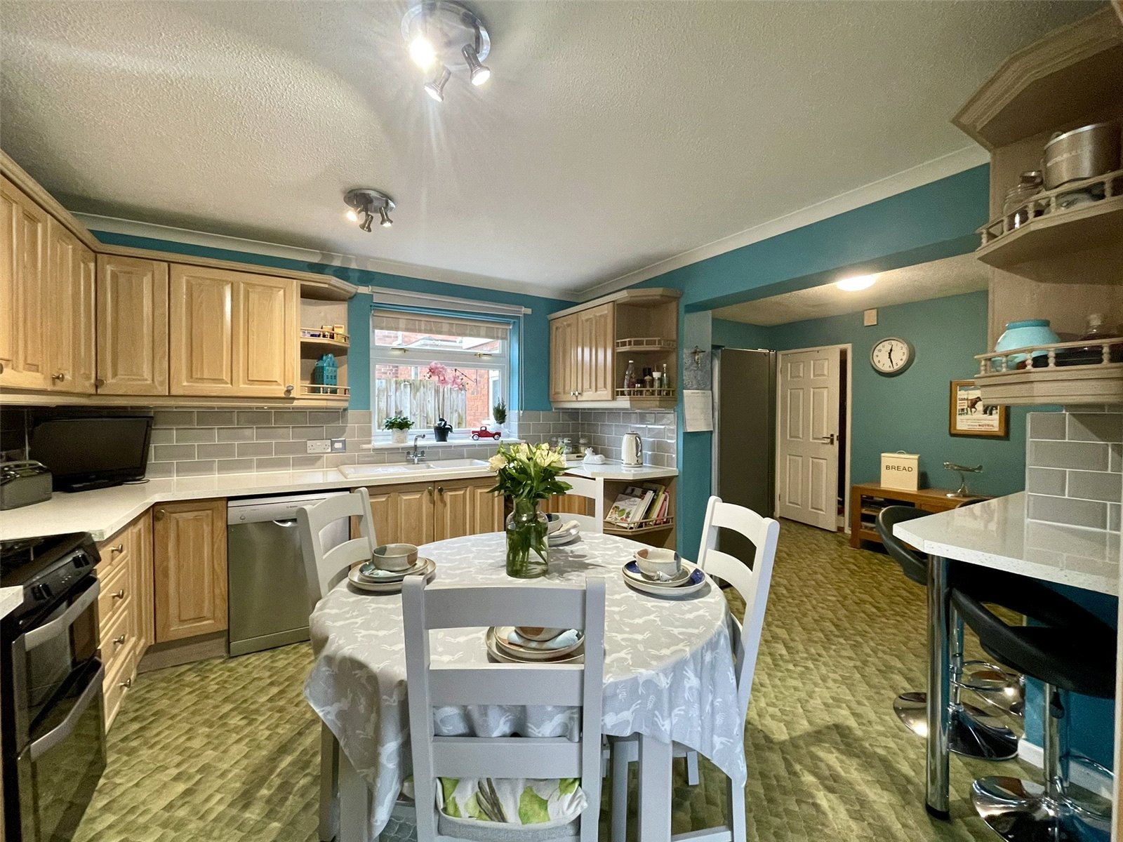 Fitted with a good range of limed oak fronted units beneath more recent quartz style worktop extending around three sections plus a Breakfast Bar stretching into the Dining Room. Cupboard and drawer storage options combine with plumbing for dishwasher, space for an electric cooker with concealed extractor hood above, wine storage, wall cupboards with fitted cornice and pelmet detail, gallery railed shelved corners and ceramic single drainer sink unit with drainer bowl and mixer tap. Good natural light as a result of a good size window plus light from the adjacent Garden Room.