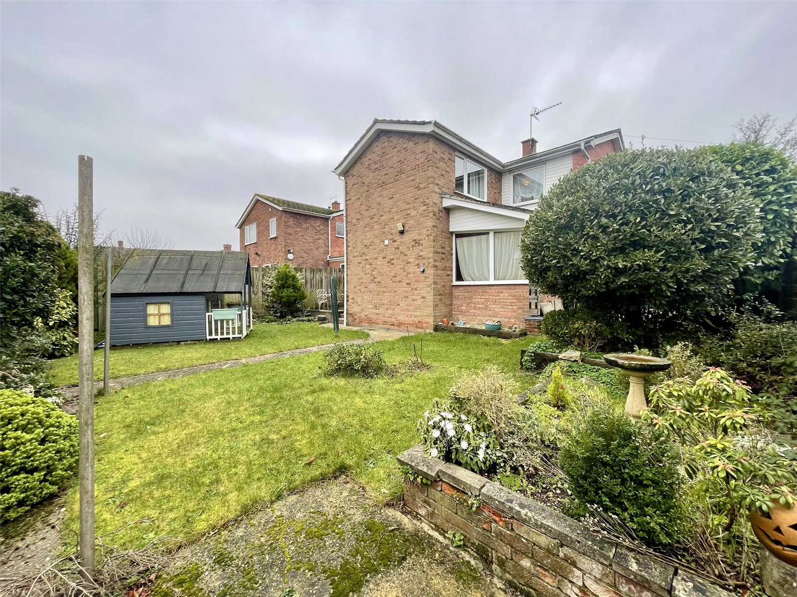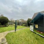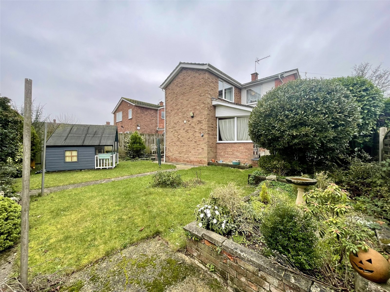 Being on a corner, the house benefits from a wide open frontage bordered by the kerbed footpath. To the front of the garage is off road parking. Two side gates, one either side, lead to the rear and side garden space combining patios and grass along with planted borders and beds. A SUMMER HOUSE will remain. Outside lights. Oil storage tank. Oil fired boiler supplying domestic hot water and radiators.