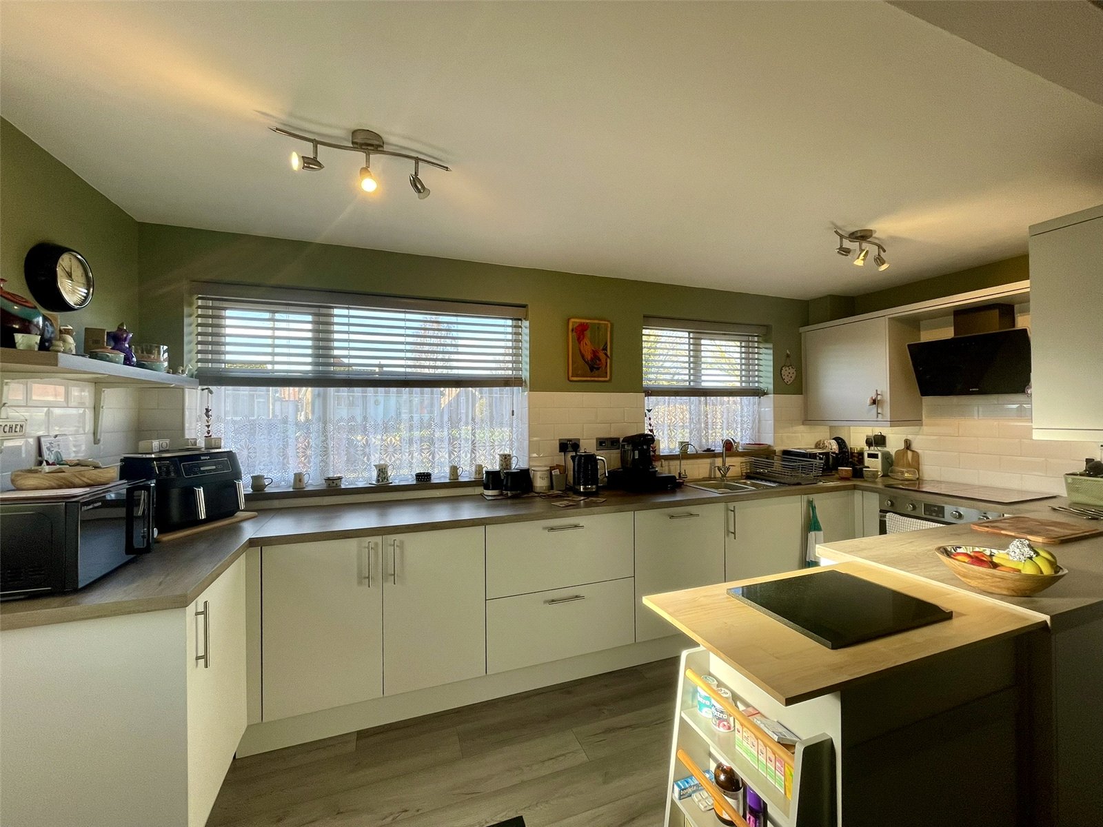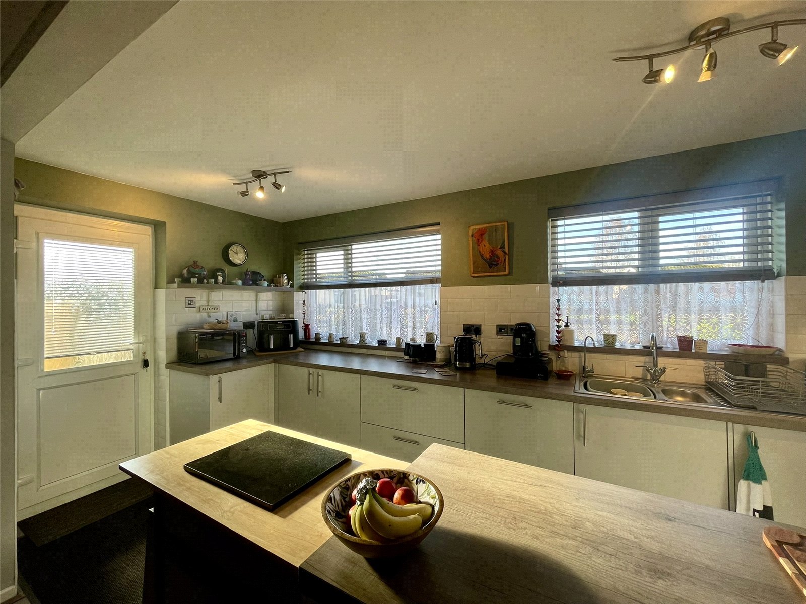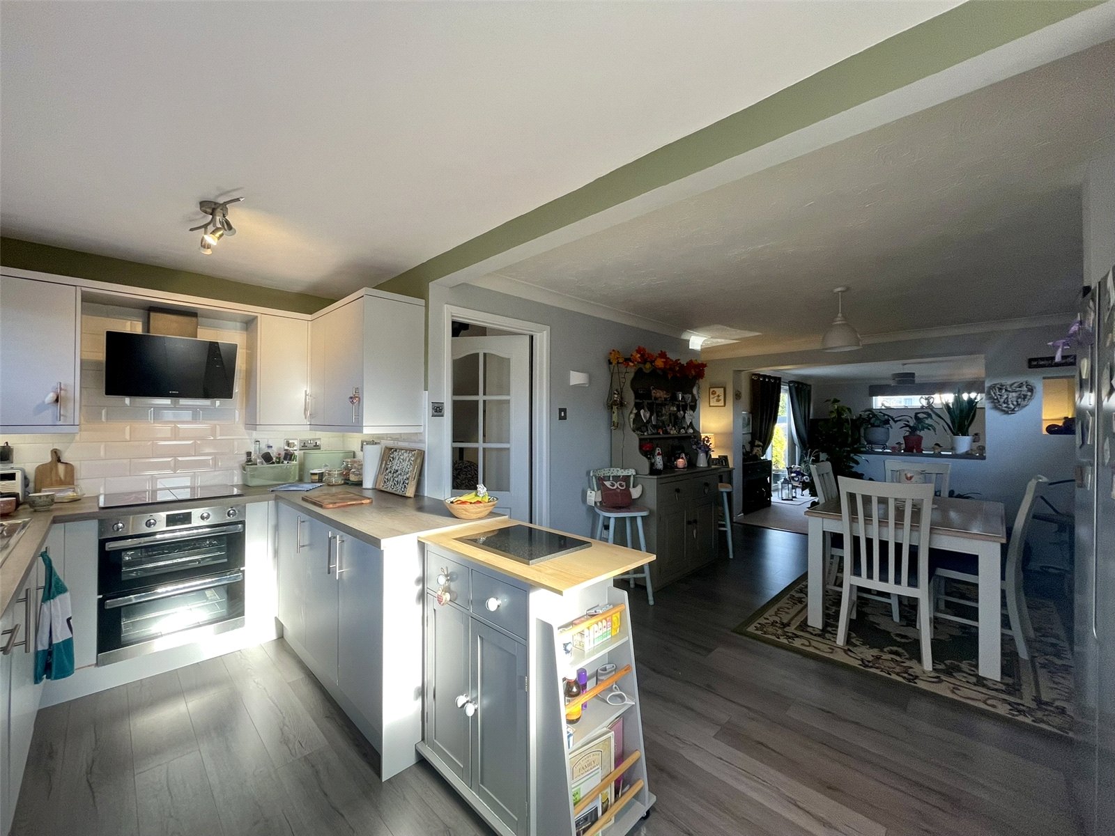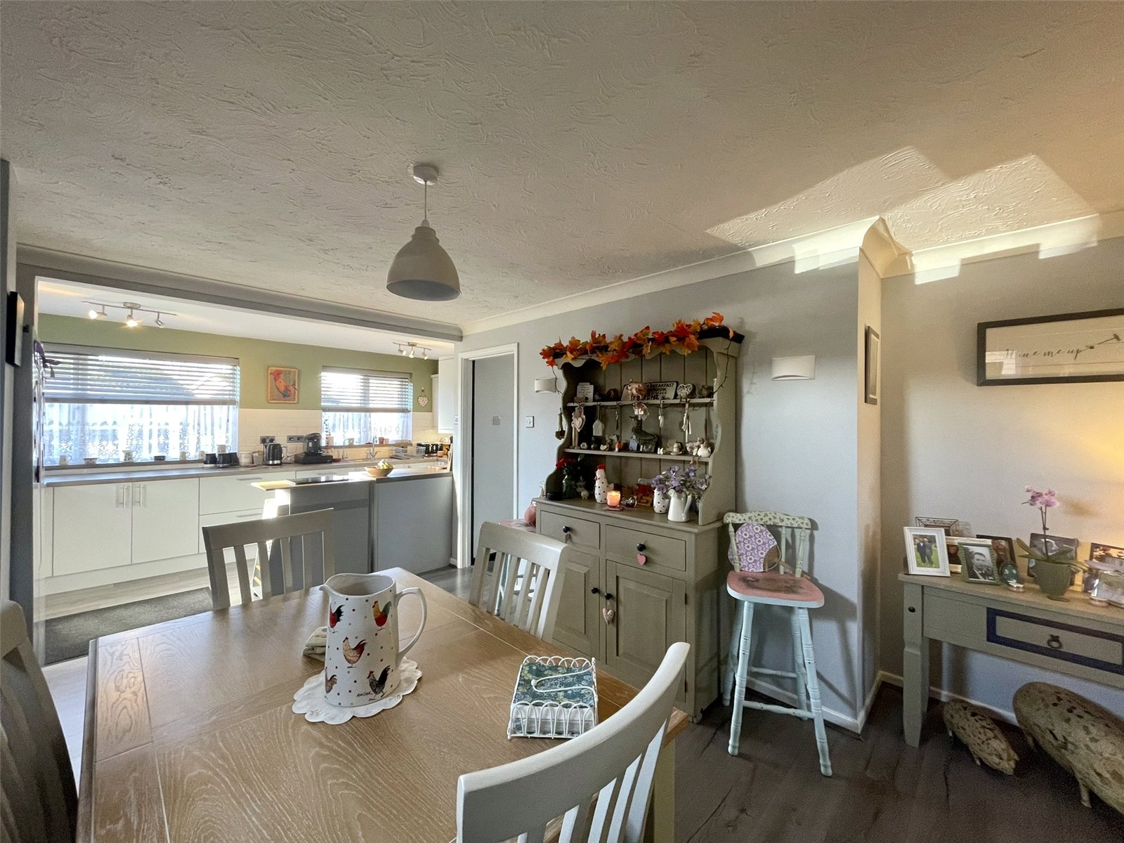 Extending across the front of the house with two PVCu double glazed windows providing not only good natural light but a good aspect across the front garden and beyond. Smart woodgrain effect worktop extends across a variety of flush fronted cupboard and drawer storage options all on 'soft-close' mechanisms and including deep pan drawers and two 'magic' corners. Integrated dishwasher. Four ring electric hob with Elica vertical inclined extractor hood, Belling double oven. Wall cupboards to match with cornice and pelmet detail and under lights. Stainless steel sink unit with drainer bowl and mixer tap along with non-softened drinking tap. Fitted water softener. A half glazed outer door leads to the side path to the right of the house.