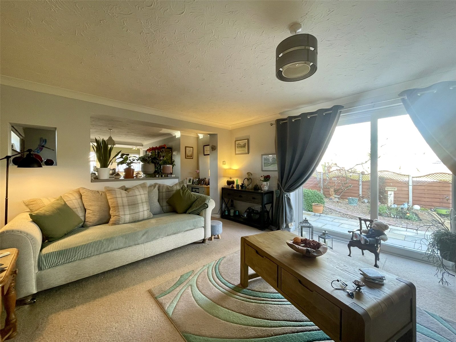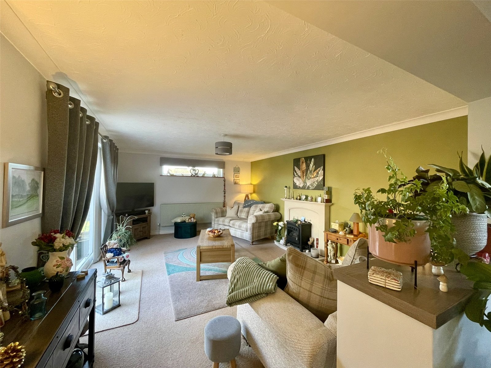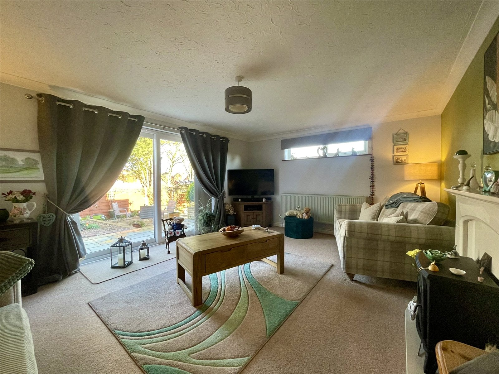 With sliding patio doors opening onto an attractive paved terrace and side garden enclosed with decorative panel fencing. Beyond, the tree lined pathway running alongside Gaye Crescent provides an attractive backdrop to the landscaped area of new housing. A focal point chimney piece with matching hearth accommodates an electric woodburning stove type appliance with a gas point adjacent. Double radiator. Television point.