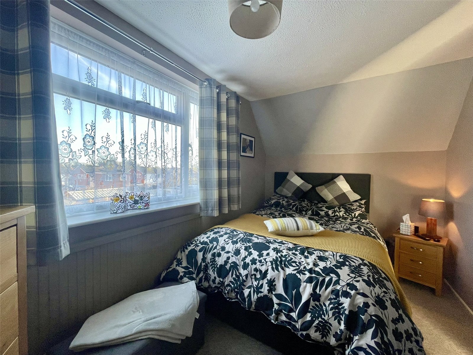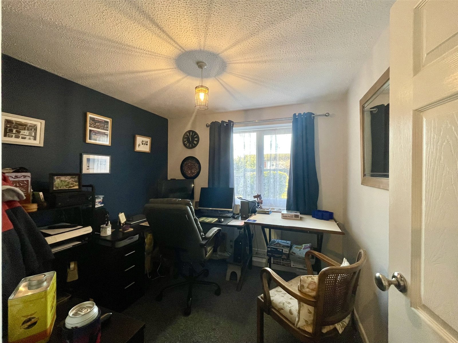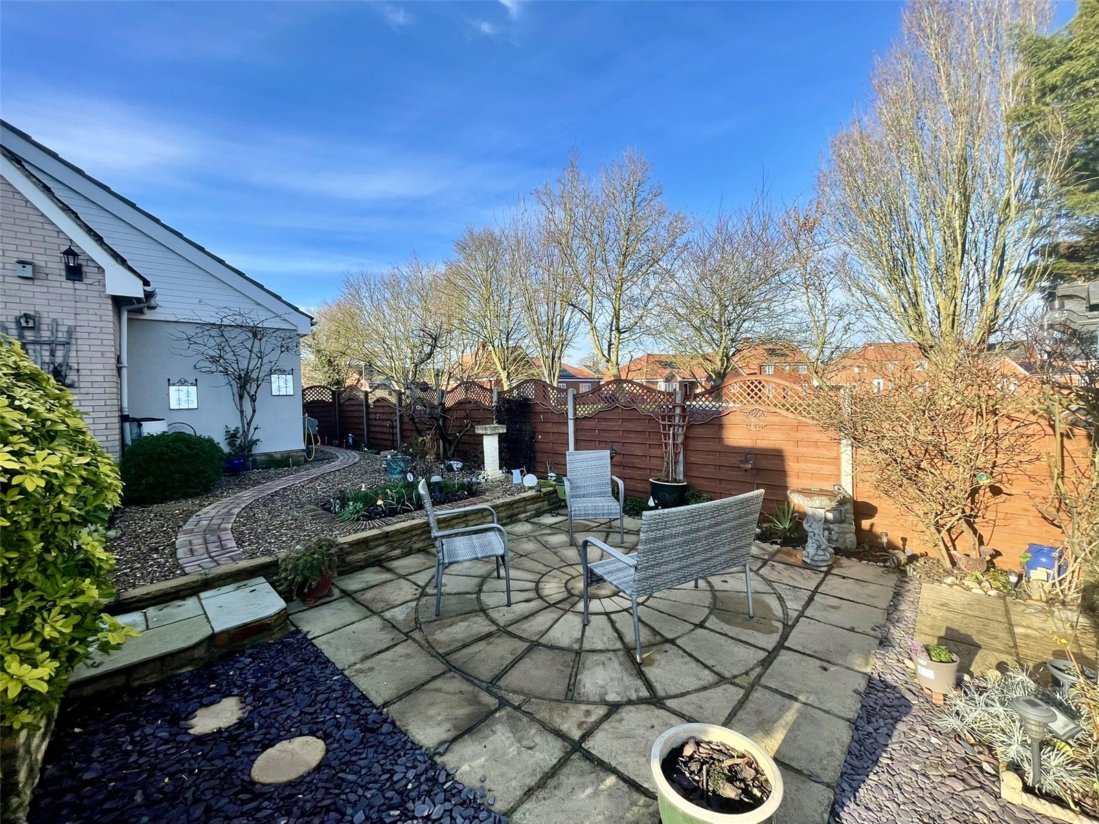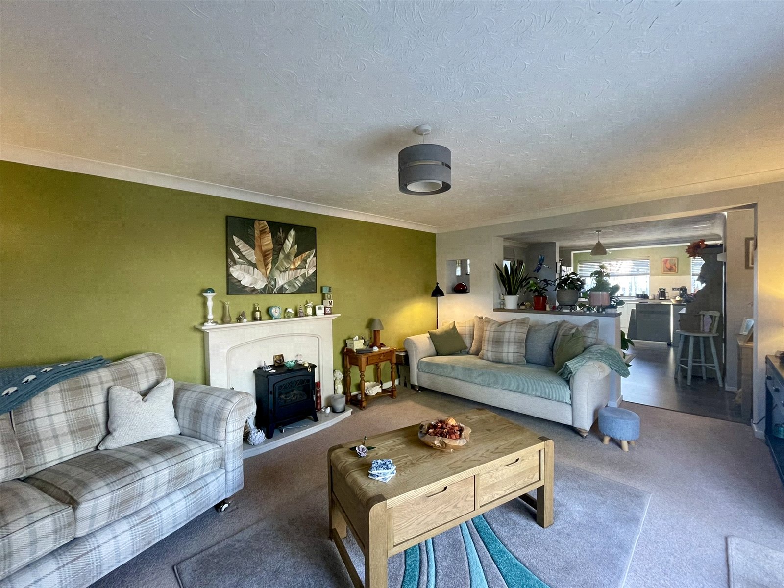 With sliding patio doors opening onto an attractive paved terrace and side garden enclosed with decorative panel fencing. Beyond, the tree lined pathway running alongside Gaye Crescent provides an attractive backdrop to the landscaped area of new housing. A focal point chimney piece with matching hearth accommodates an electric woodburning stove type appliance with a gas point adjacent. Double radiator. Television point.