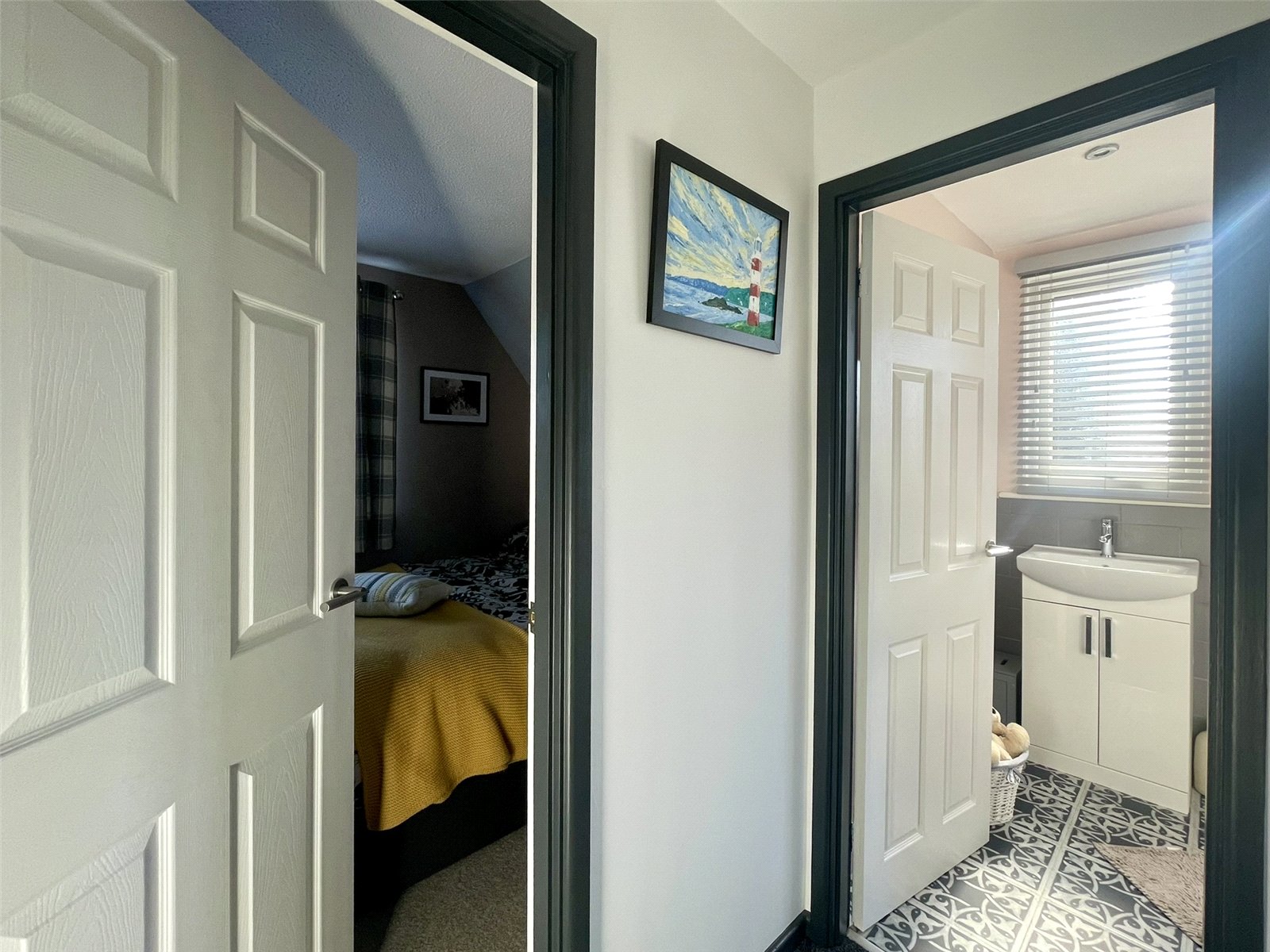 Being a continuation of the roofline again with high rooflight and side window adding yet more natural light. A smart suite comprises vanity washbasin with cabinet beneath, low level wc and quadrant shower enclosure. Extensive tiling and matching floor. Vertical railed towel rail radiator.