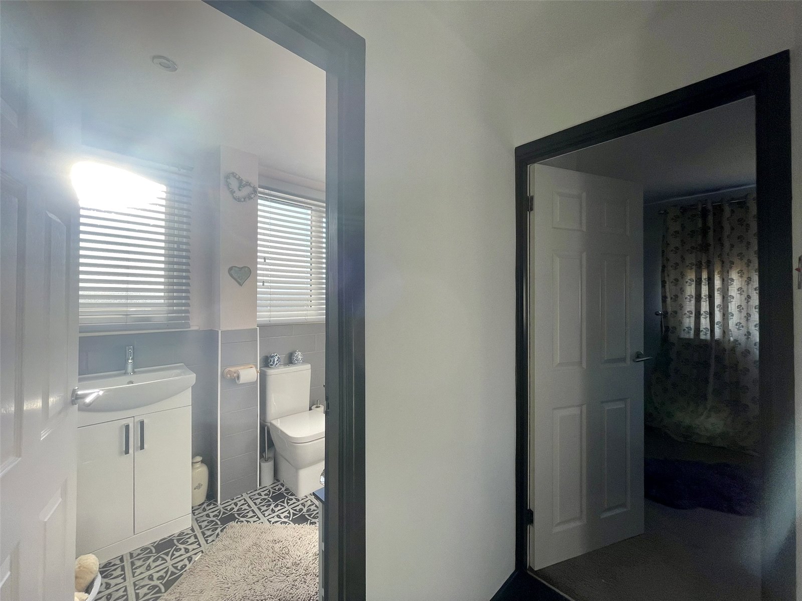 Stylishly appointed with suite comprising P'Bath with Mira Enthuse shower unit fitted above, side taps and side screen. Low level wc along with vanity wash basin with cabinet storage beneath. Railed towel rail radiator. Two windows providing good natural light. Smart flooring with Art Nouveau style flooring tiles.
