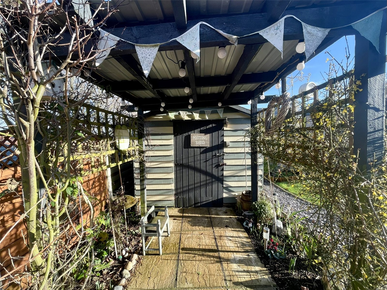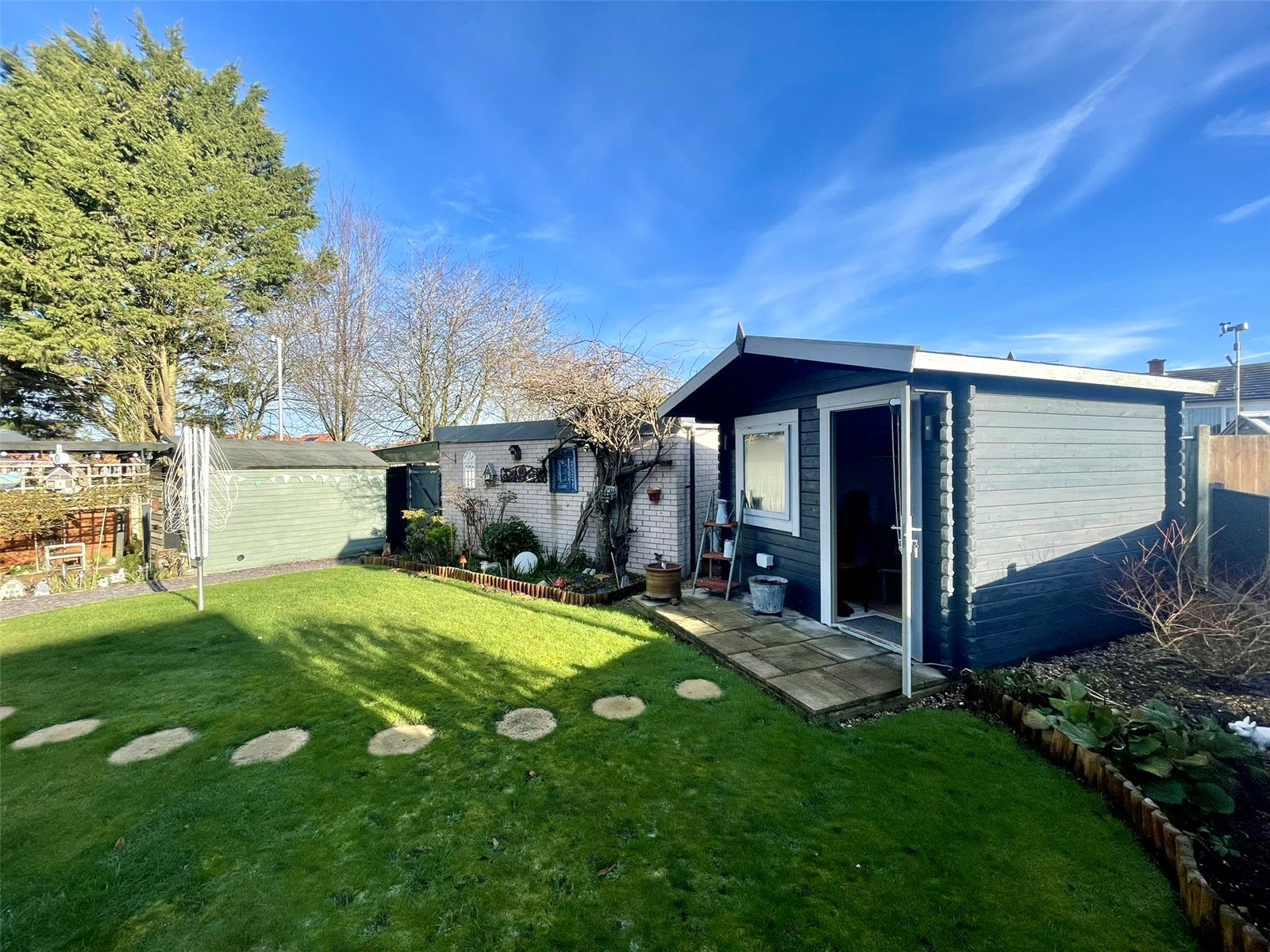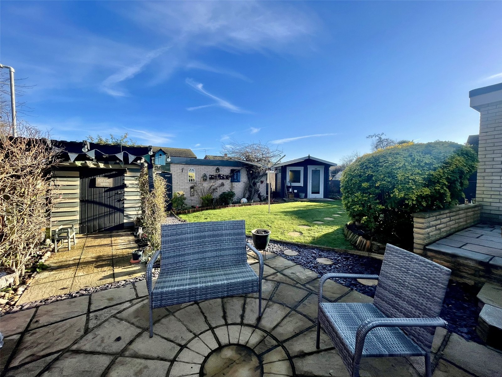 No.11 Gaye Crescent occupies a corner plot at the top of the cul de sac enabling a lovely open frontage, extra width along the road side plus covered parking CAR PORT to the front of the SINGLE GARAGE (17' x 8'2/ 5.18m x 2.51m) which can be found at the end of the garden. The whole 'package' works so well with a gate from the parking area, side gate from the cul de sac path plus access to the front door along with a path to the right hand side door and (3rd) garden gate. The current owners have greatly enhanced not only the interior but also the garden with for example a new paved terrace and other landscaping elements and timber SUMMER HOUSE. This summer house is far from a storage building and one which is used throughout the year as a Garden Office/Hobby space complete with power and light. Towards the rear gate a further timber building serves as a Potting Shed/Garden Shed dressed with a pergola at the front adorned with climbing plants. Lawn, gravel and planted borders and beds complete the overall very pleasing picture. Outside power. Outside light. Outside tap.