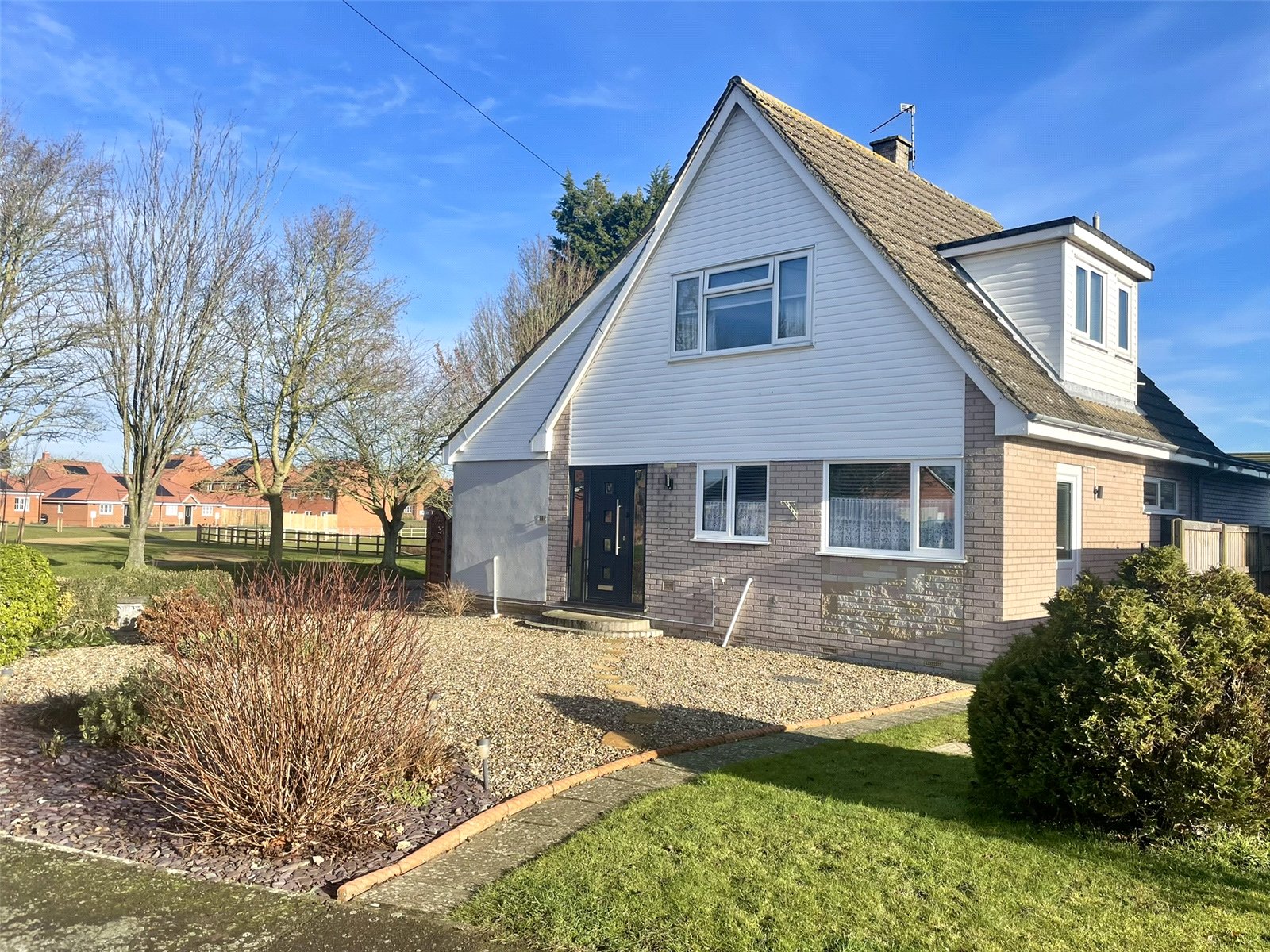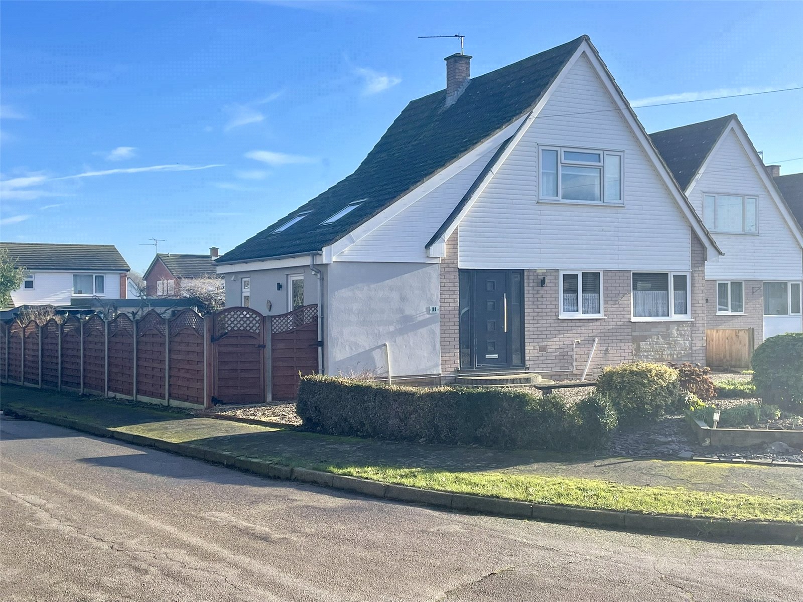 Built originally towards the end of the 1960's, this chalet style property has been cleverly extended and enhanced taking full advantage of the excellent corner plot. Additions to both the side and rear of the original property have created superb living space including a welcoming hallway, utility room, shower room and additional reception room. The day space is essentially open plan albeit with partial divides but makes for a friendly social space of good proportion. Upstairs, built-in wardrobes serve both of the principal bedrooms with the optional 3rd bedroom (downstairs) currently being used as a Study. Windows are double glazed throughout along with gas fired radiator heating having replaced the original oil system and boiler arrangement. It is also important to note the corner plot, unlike the majority of neighbouring properties, allows for a GARAGE & CAR PORT set to the bottom of the garden and accessed direct from the road. A gate leads directly into the garden.