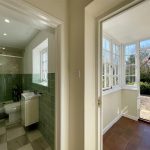 A smart bright space with extensive tiling in an aquamarine colourway and fitted with a suite comprising an off floor wash basin and stand with cupboard. Low level wc. Shower enclosure with monsoon head with hand held showers. Cast style radiator with towel rail. Extractor fan. Window.