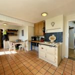 A sizeable space laid with 9" pamment tiles, narrowing to one end towards the pantry and with ample space for a table and chairs. A part glazed multi-point locking rear door leads to and from the terrace at the rear. A further door opens to a PANTRY complete with shelves, plumbing for washing machine and water softener. A classic cream Aga serves cooking needs along with contributing towards the hot water and one radiator. Units comprise open fronted framework with oak block worktop incorporating a Shaws Original double ceramic sink. A Camray II oil fired boiler supplies domestic hot water and radiators. Double radiator with thermostatic valve. Window to the rear.