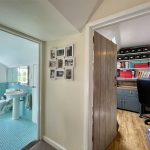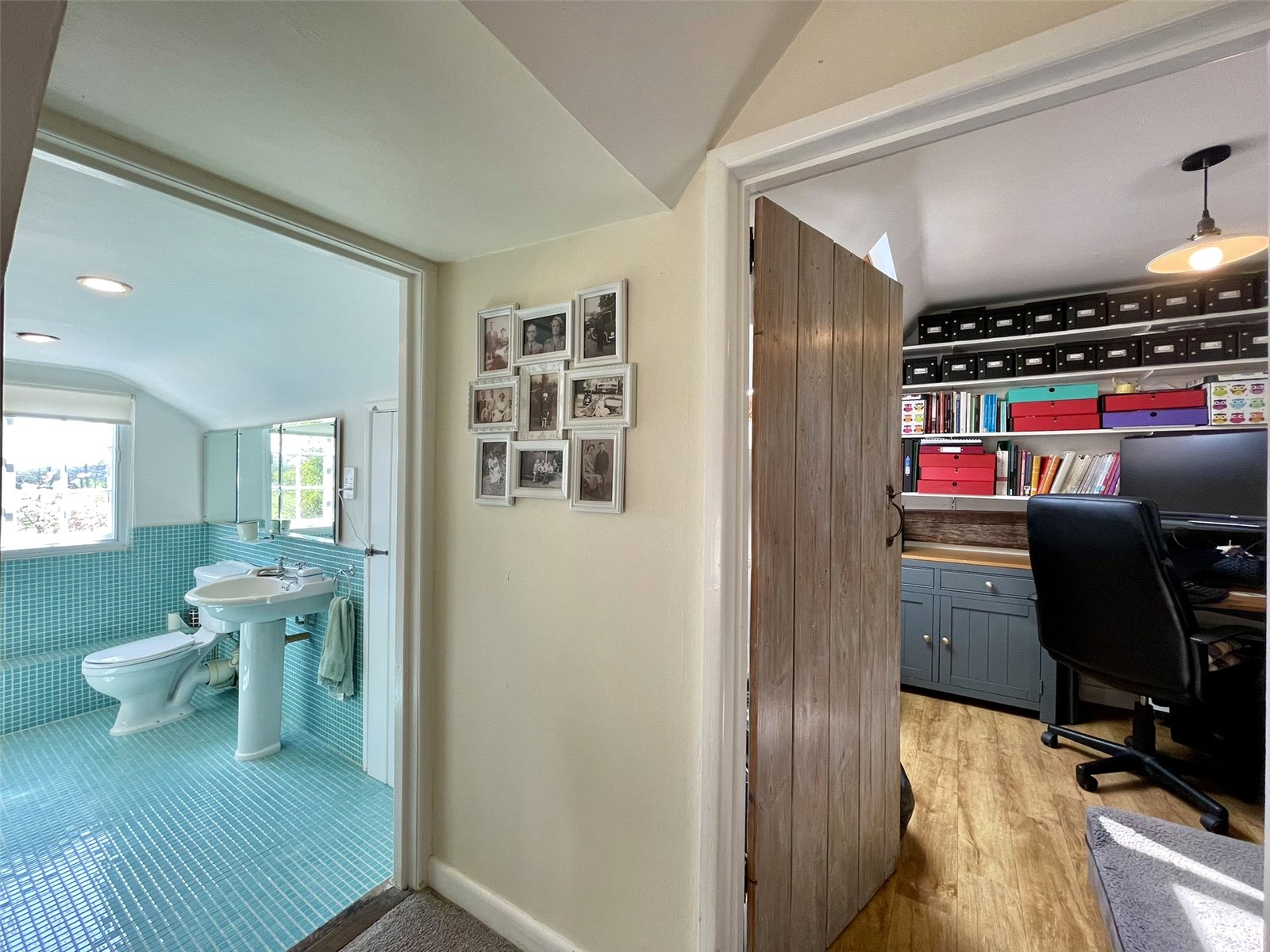 Eye catchingly well appointed with aquamarine mosaic size tiles across floor and walls setting off the white suite comprising roll top 'No Arguments' bath, low level wc and pedestal wash basin. A dormer window provides a lovely view out towards the meadow beyond the rear boundary. Shaver point. Built-in shelved cupboard. Single radiator with thermostatic valve.