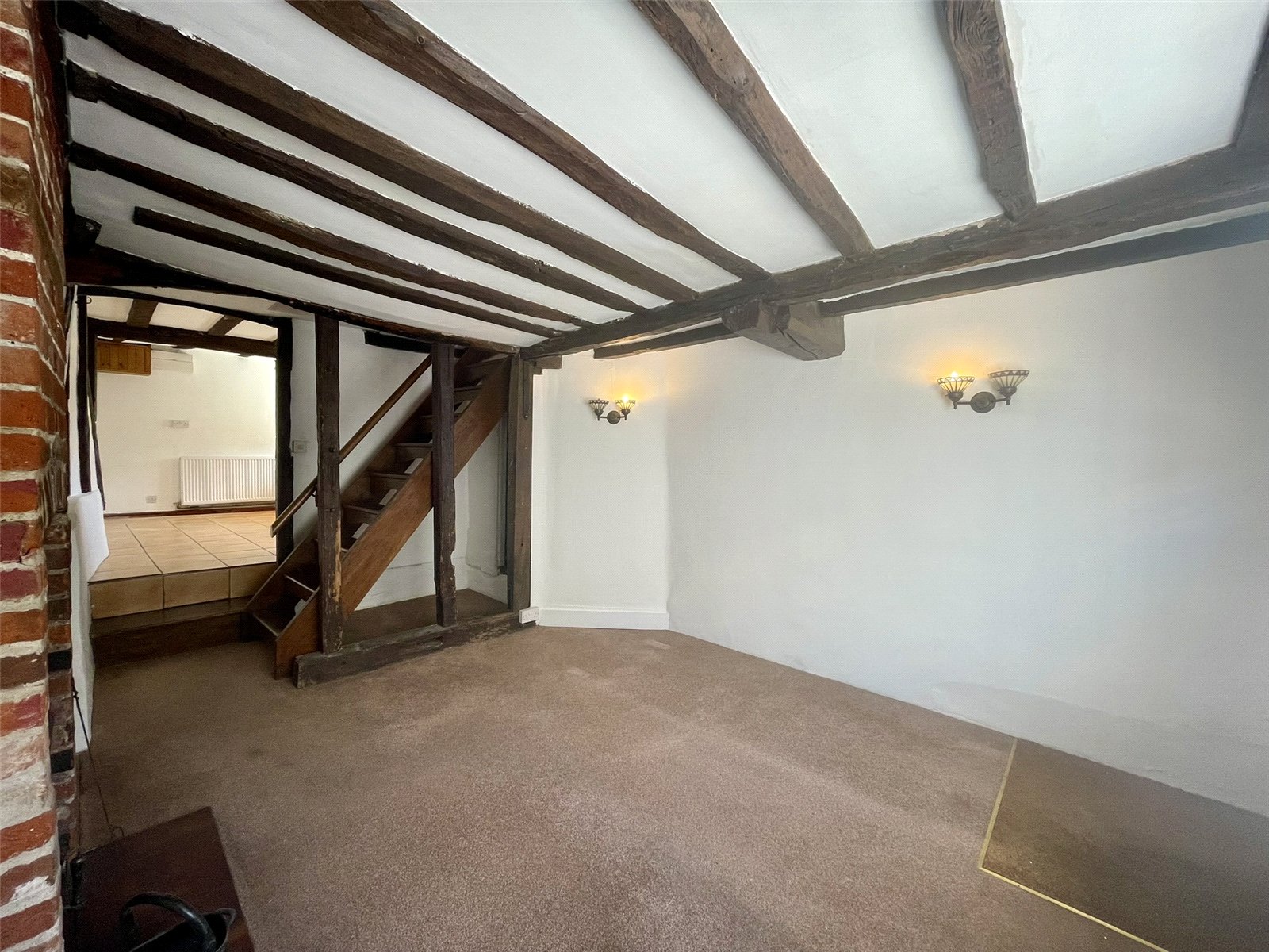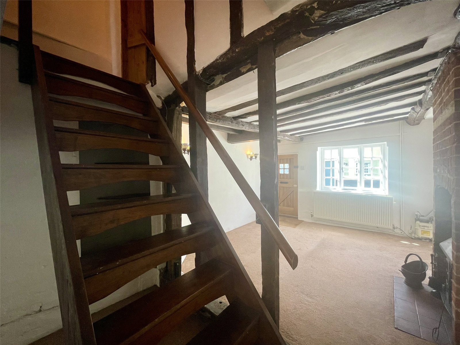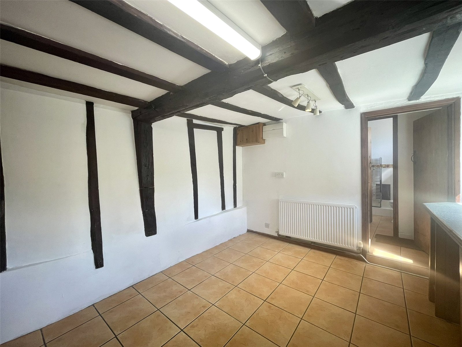 A character space with cottage window to the front elevation and red brick chimney breast and exposed timbers. The eye is drawn through, past the stairs, to the attractive timbered kitchen and to one side, beneath the stairs, a walk-in recess providing useful storage. A wood burning stove, set on a tiled hearth provides added feature and suits the nature of the cottage perfectly. Radiator with thermostatic valve. NB Ceiling height to around 6'8 (2.05m).