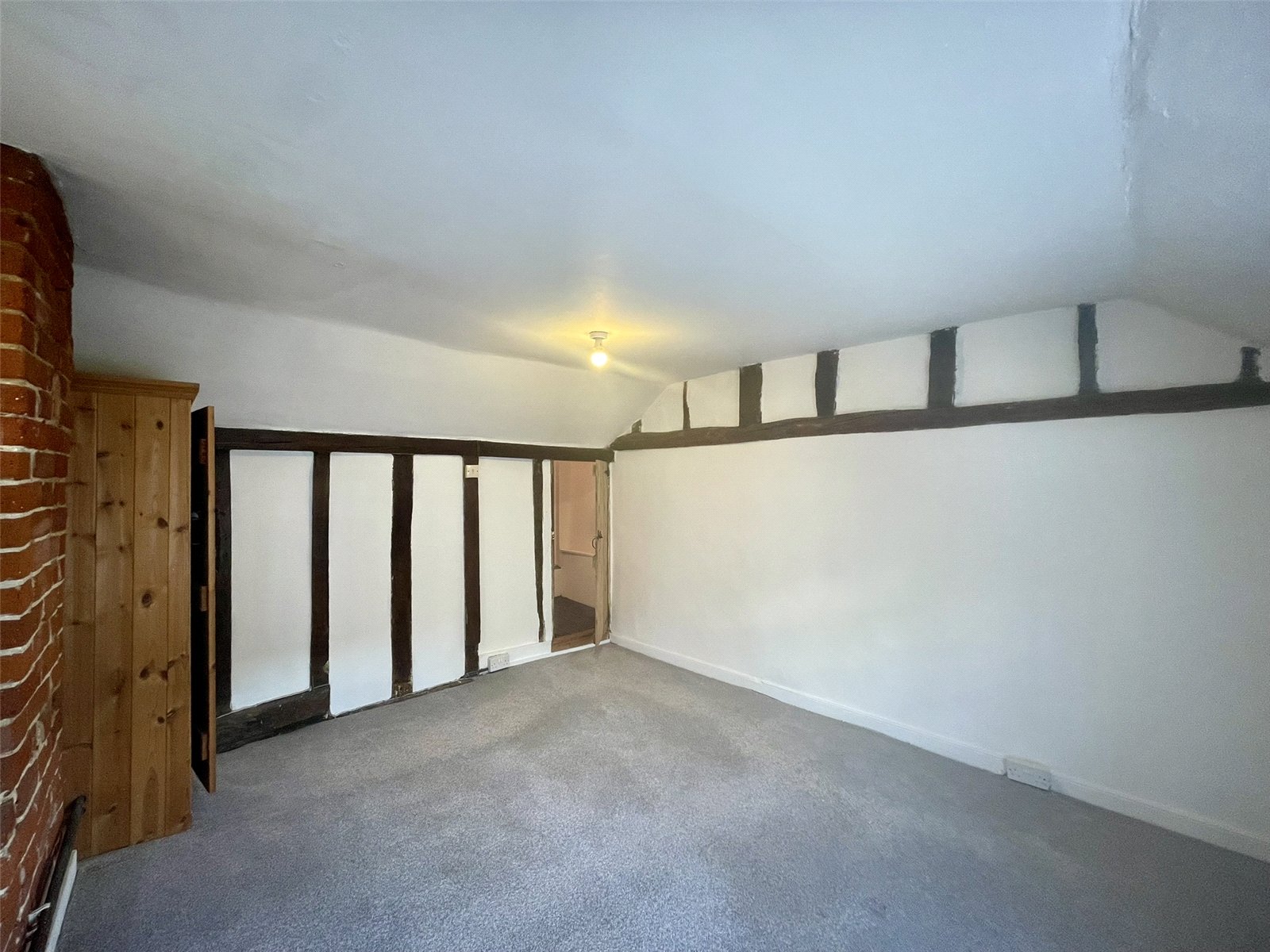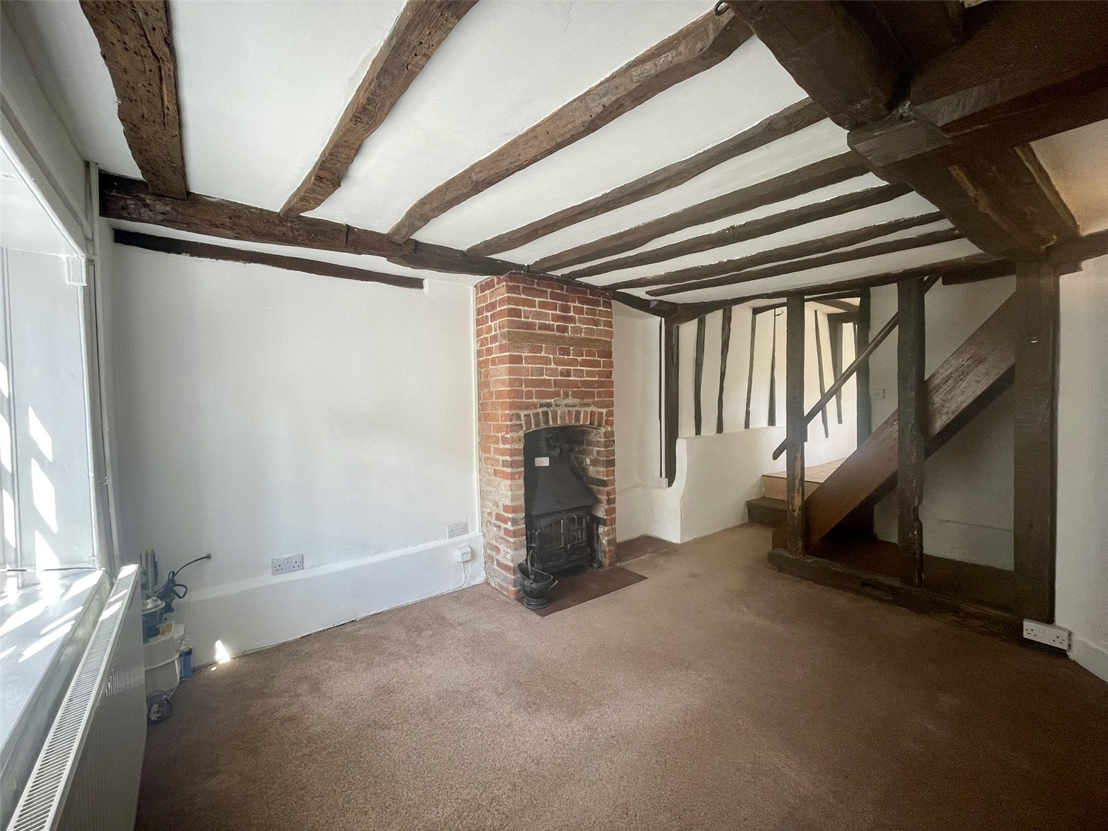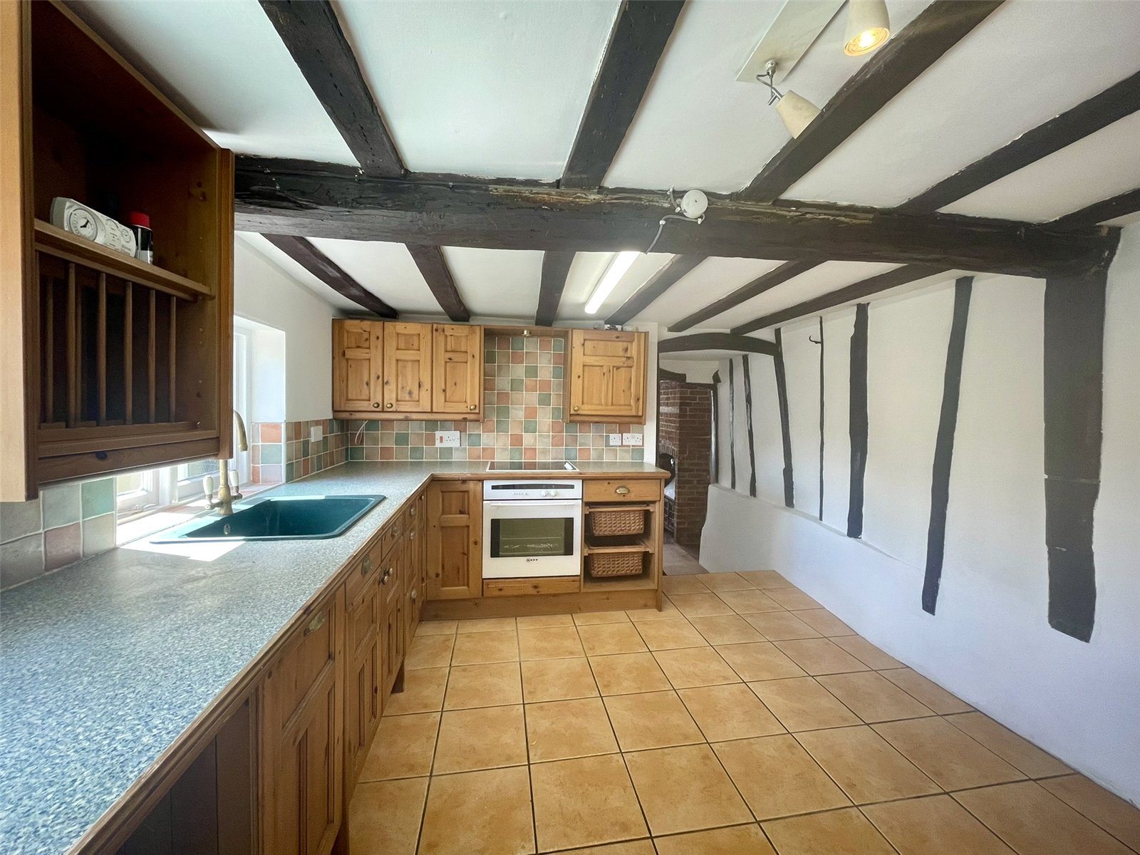 A character space with cottage window to the front elevation and red brick chimney breast and exposed timbers. The eye is drawn through, past the stairs, to the attractive timbered kitchen and to one side, beneath the stairs, a walk-in recess providing useful storage. A wood burning stove, set on a tiled hearth provides added feature and suits the nature of the cottage perfectly. Radiator with thermostatic valve. NB Ceiling height to around 6'8 (2.05m).