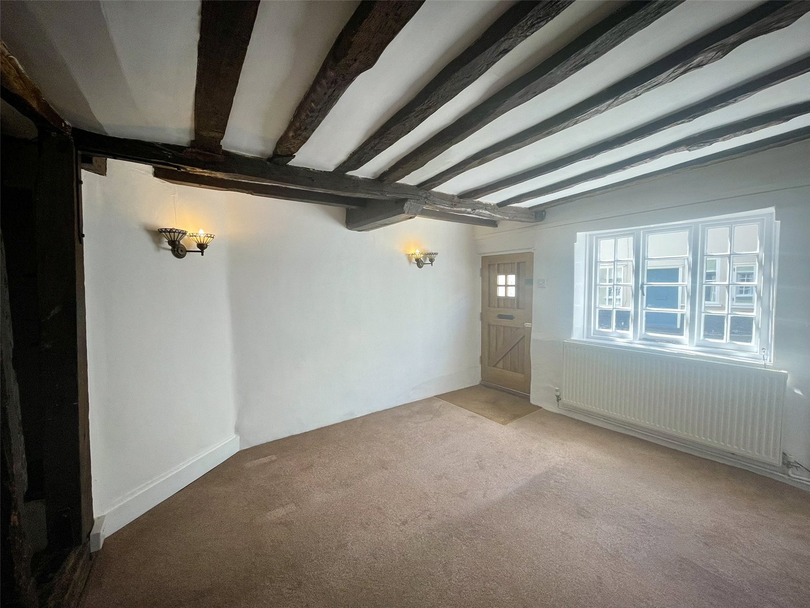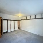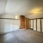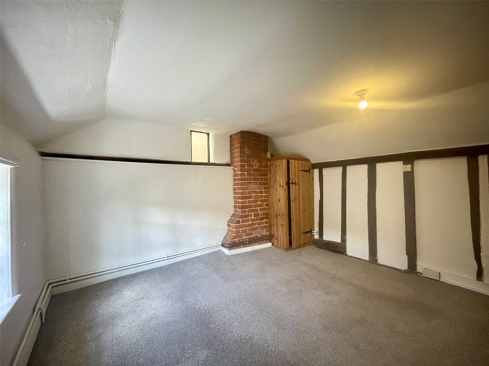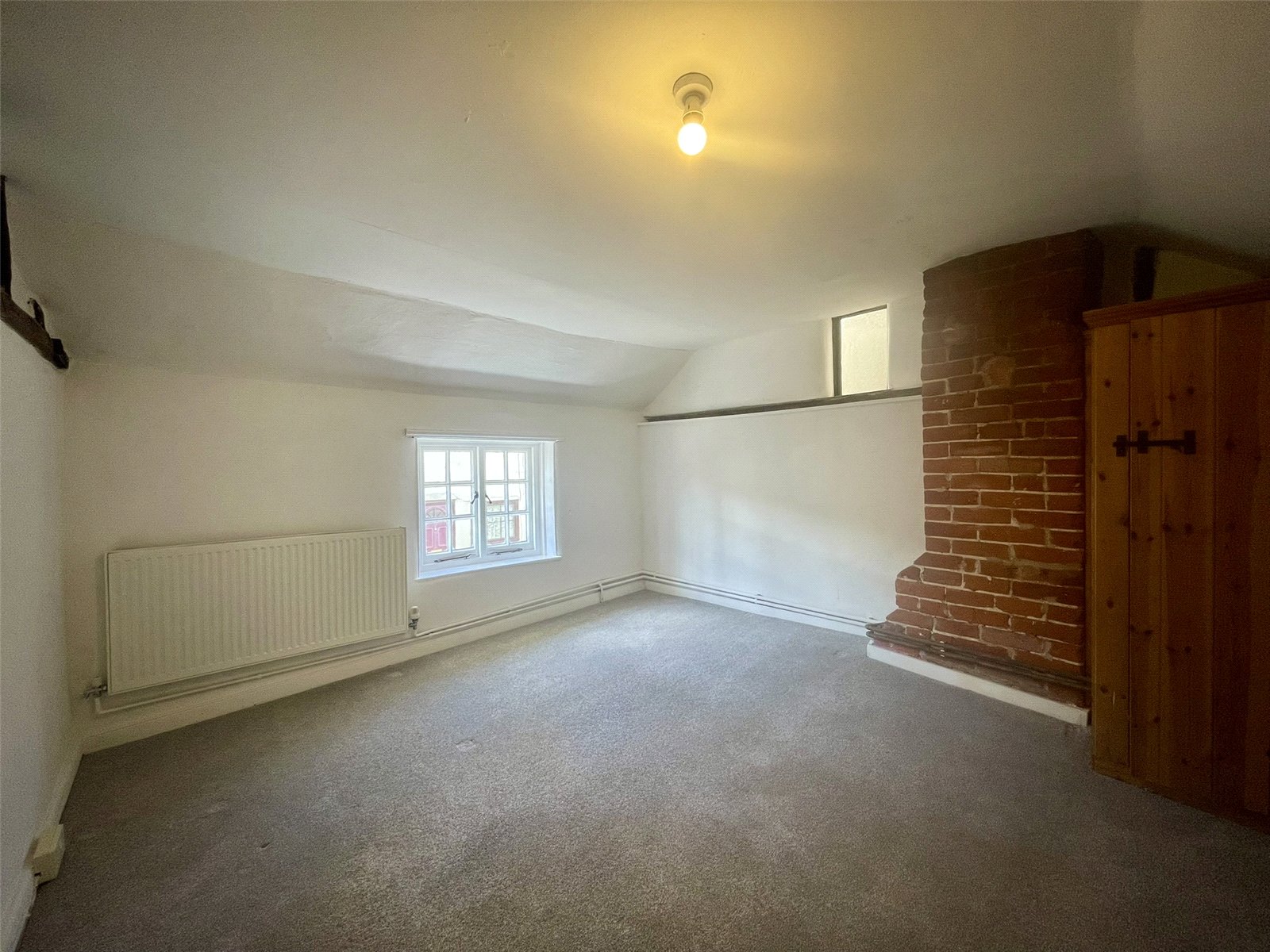 A second double room, this time at the front of the cottage and with window to the street. Built-in wardrobe cupboard to the side of the red brick chimneybreast and further, smaller window, to the side. Radiator with thermostatic valve.