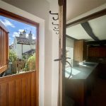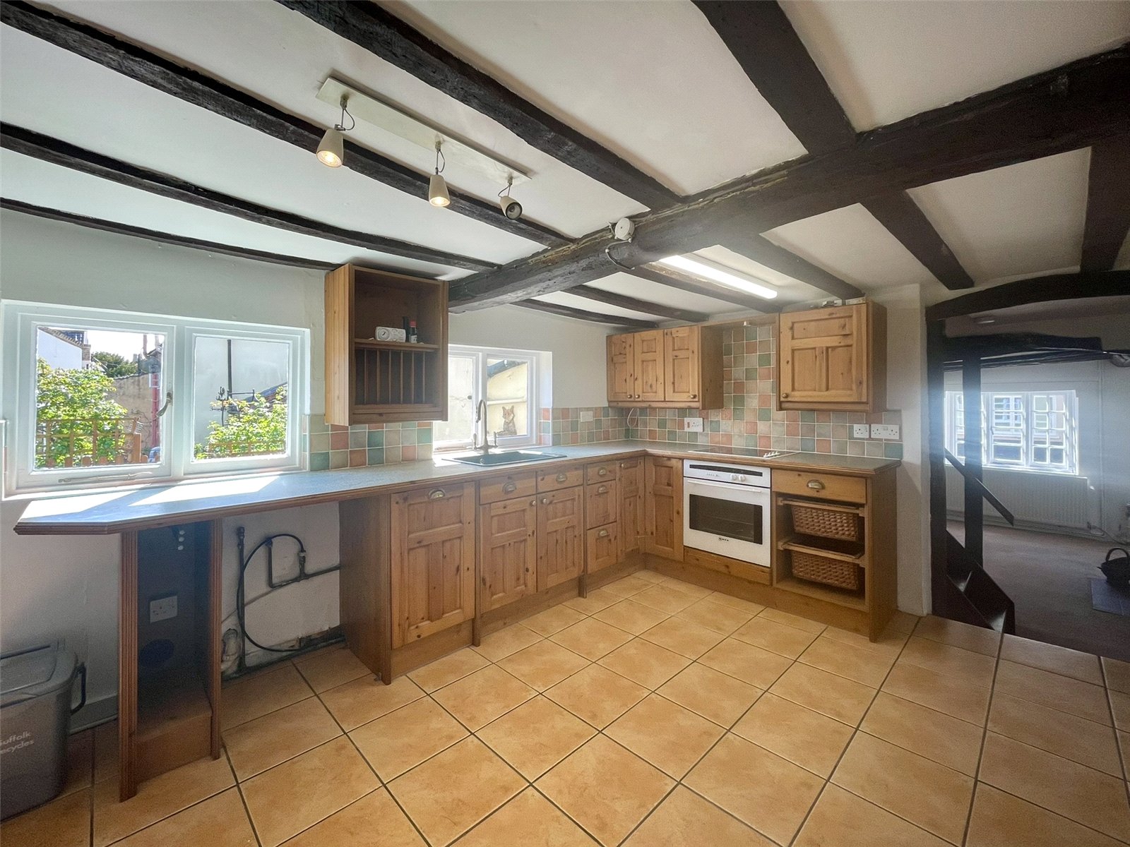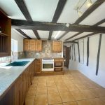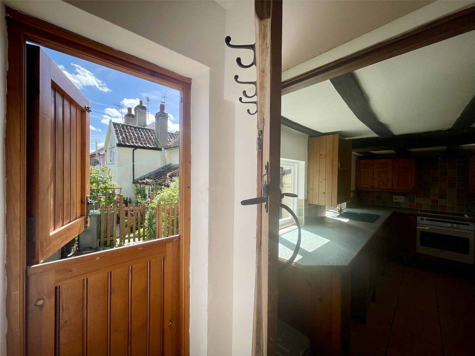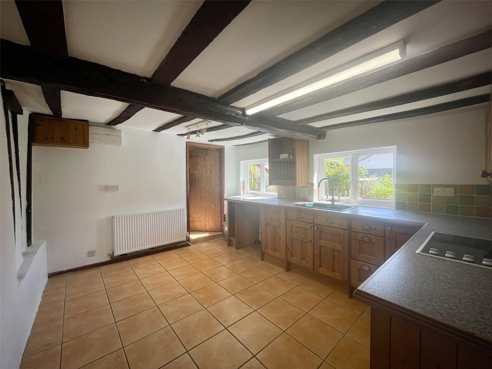 An attractive timbered space with ample table and chair space and two windows onto the courtyard garden and those of the neighbours, at the rear of the terrace. Units are fitted around two walls comprising granite effect worktop, trimmed to match the units along with cupboard and drawer storage options, plate rack and wall cupboards all with traditional brass fittings. Large traditional style sink, dishwasher, single oven and 4 ring hob and plumbing for washing machine. Radiator with thermostatic valve. A tiled floor has been laid throughout and a latch door leads through to the...