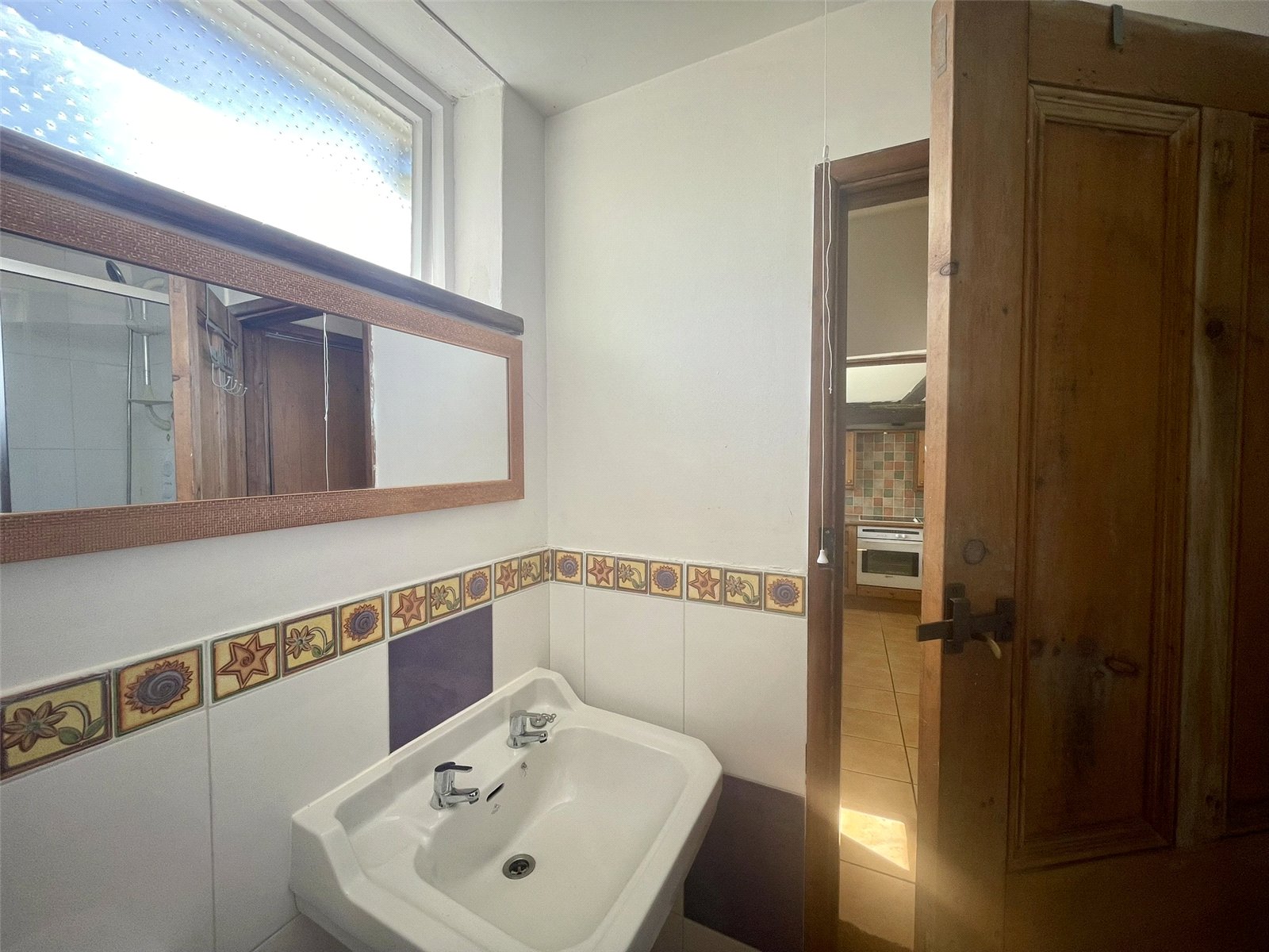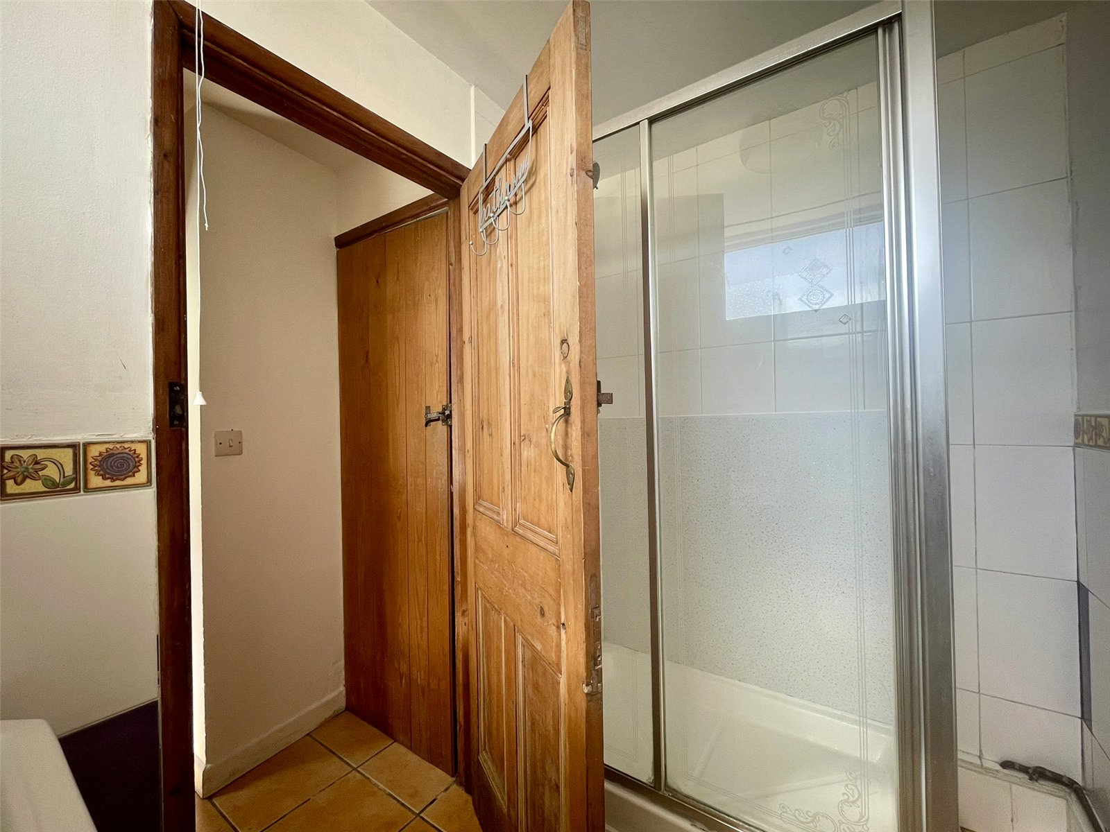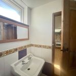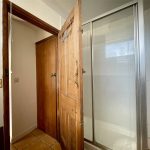 Fitted with a suite comprising low level wc, pedestal wash basin and shower cubicle housing Triton T70si shower unit. Vertical stainless steel railed radiator.