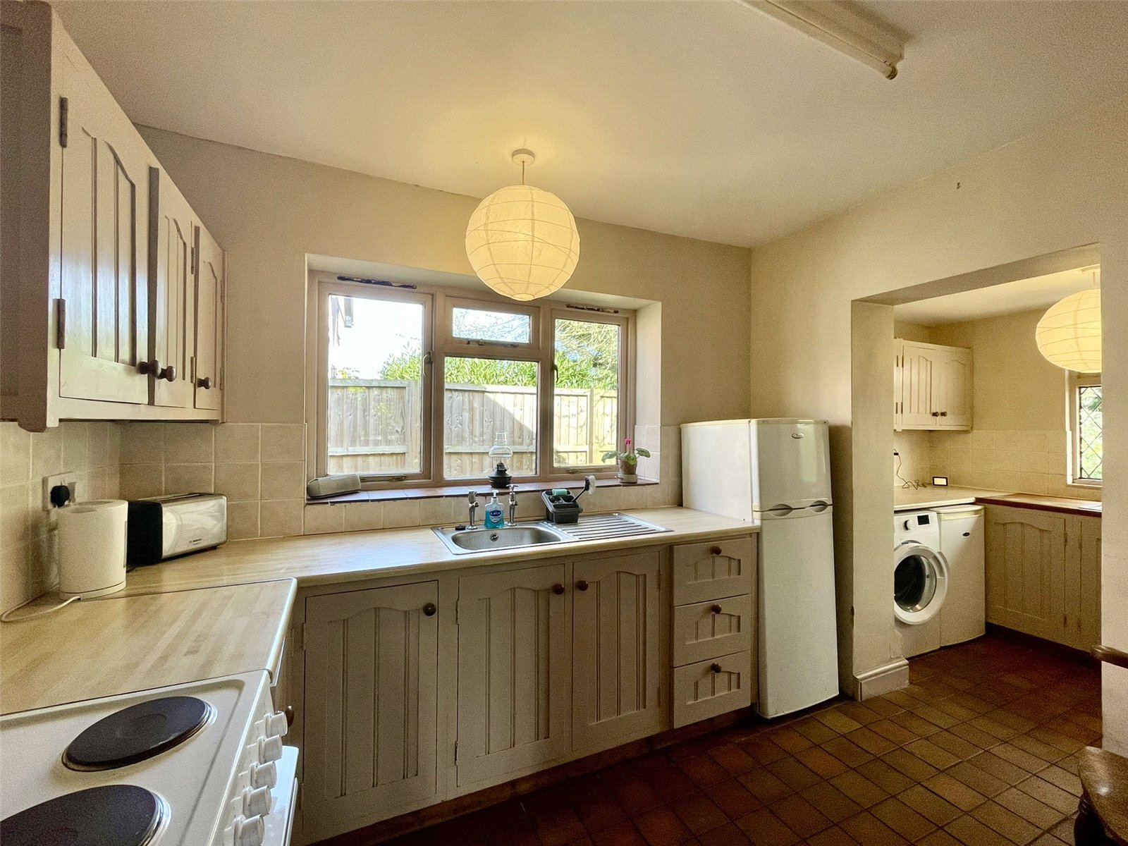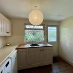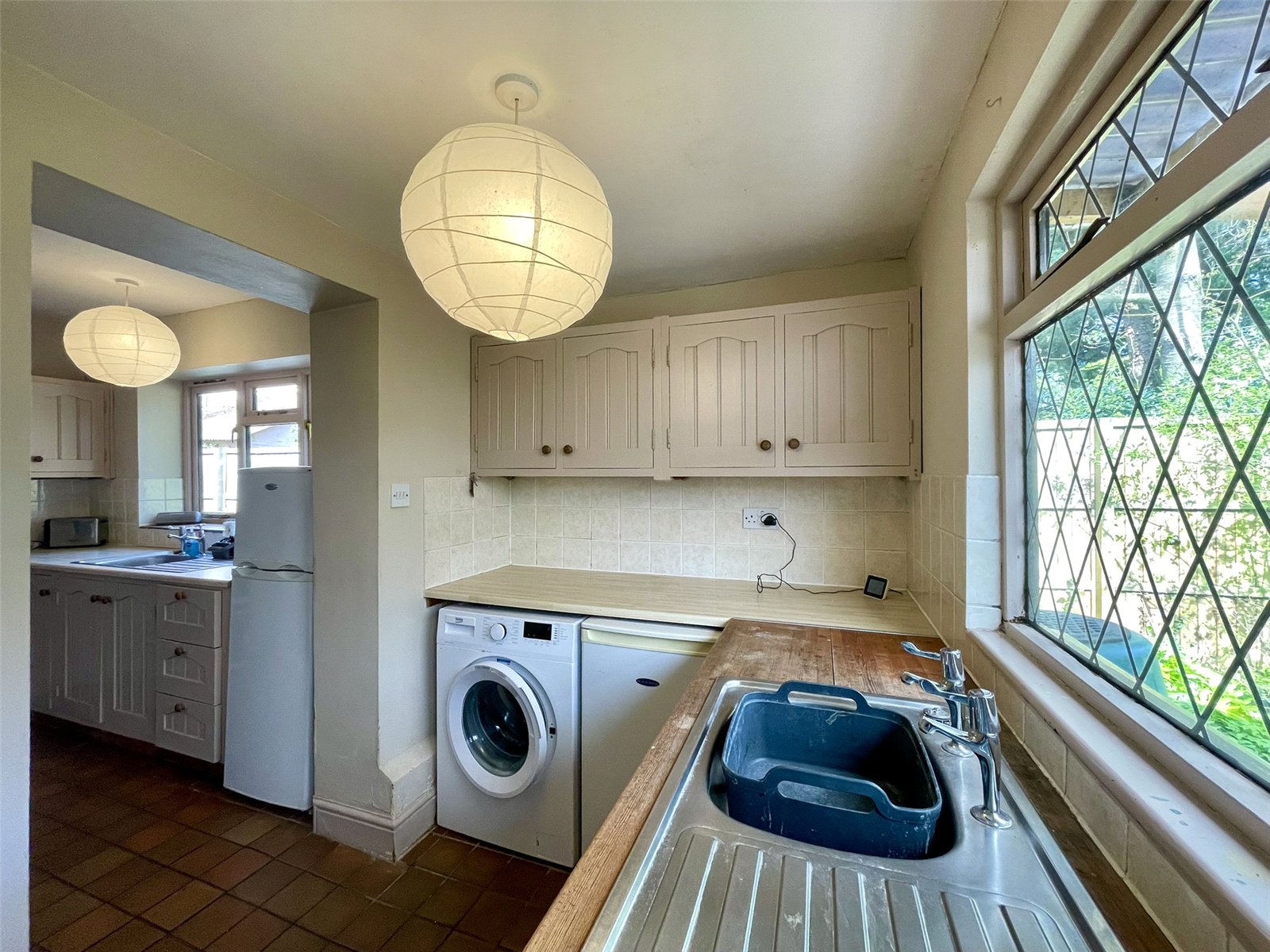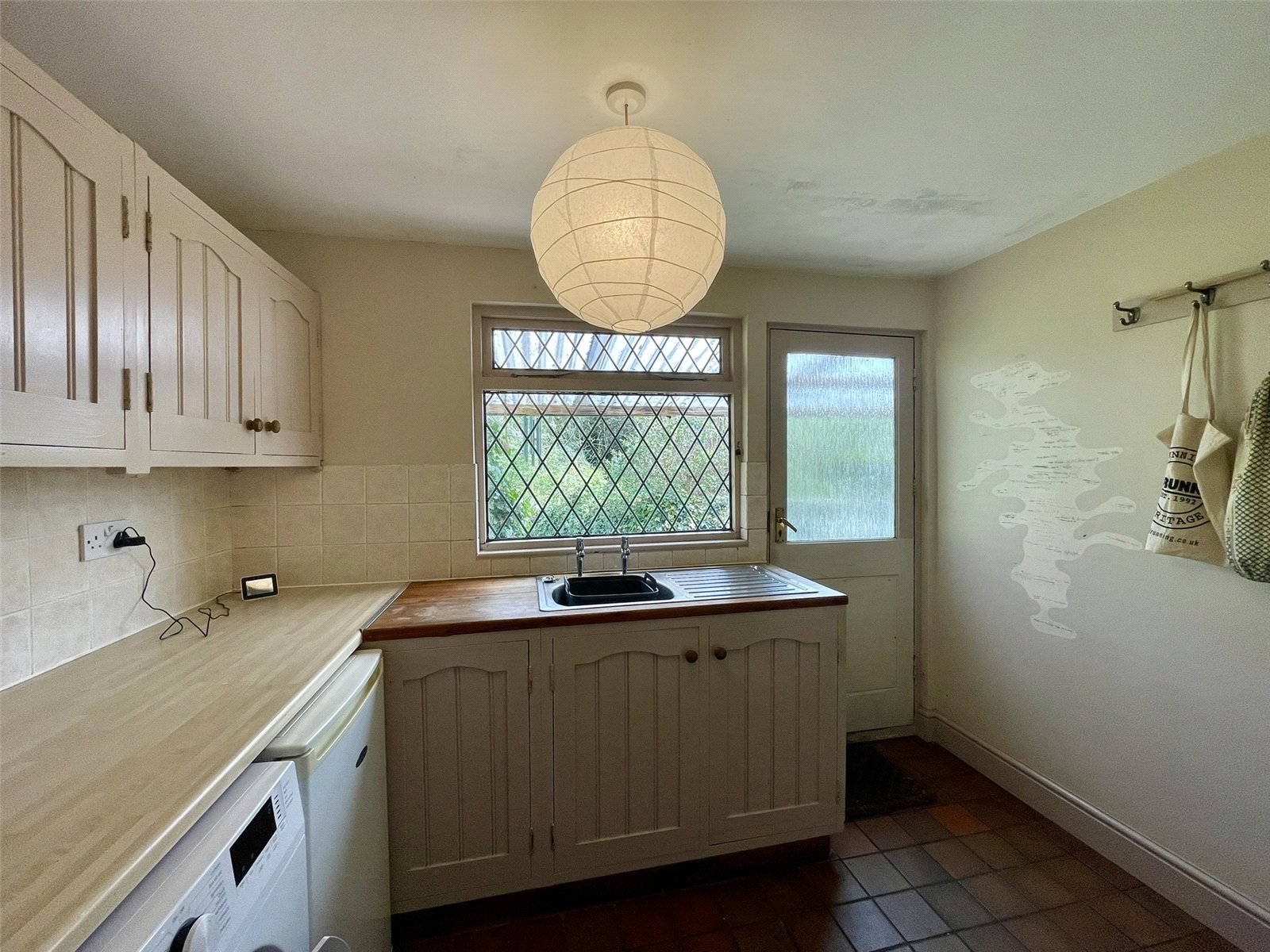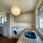 With a continuation of the quarry tiled floor leading to an outer half glazed door to the verandah. Fitted with matching cupboards and a second stainless steel sink. Twin appliance space including plumbing for washing machine.