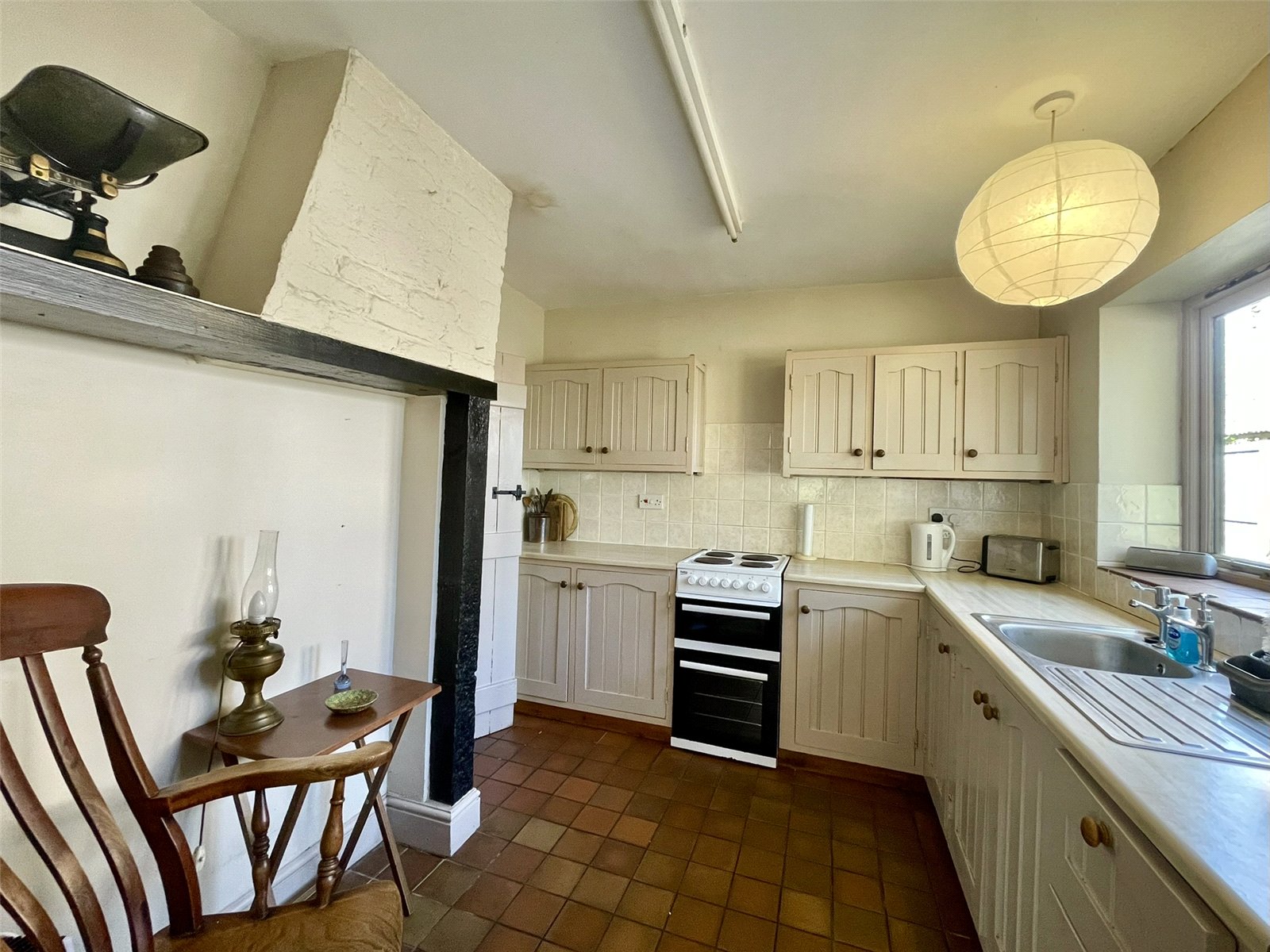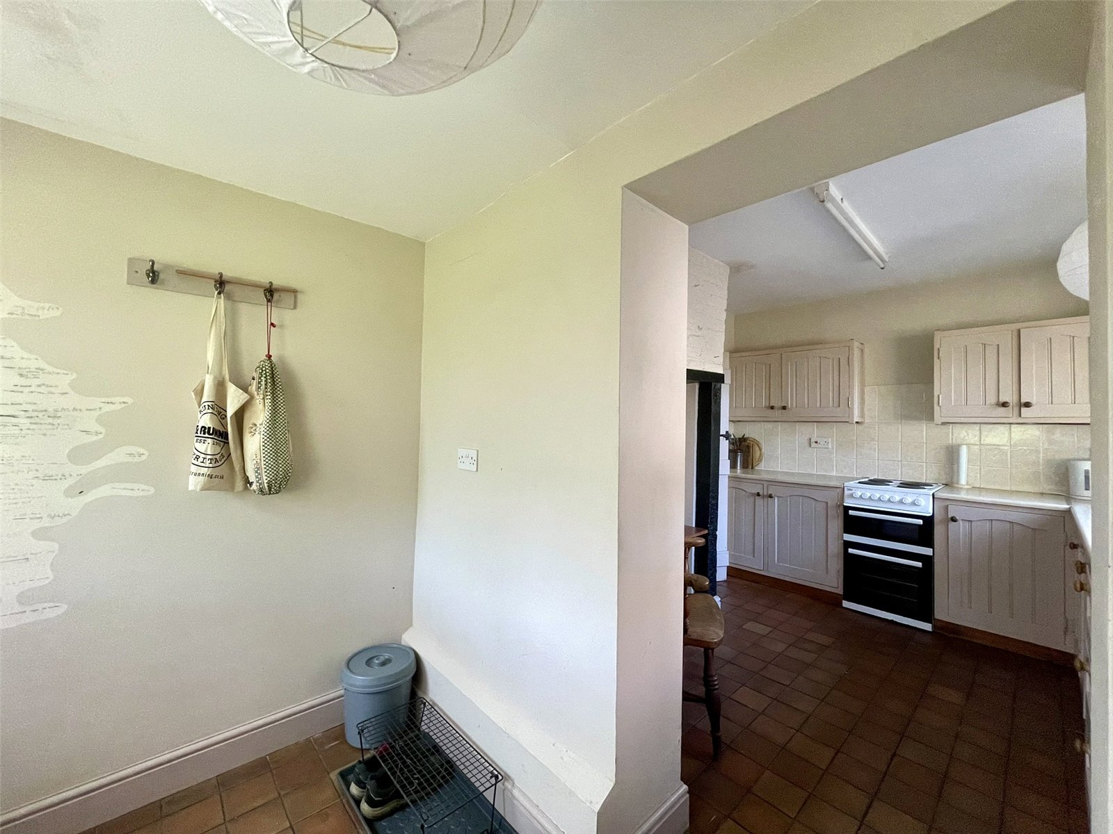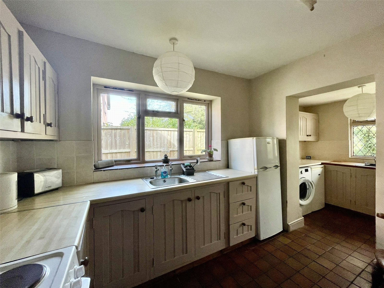 With a continuation of the quarry tiled floor leading to an outer half glazed door to the verandah. Fitted with matching cupboards and a second stainless steel sink. Twin appliance space including plumbing for washing machine.