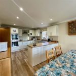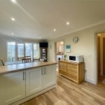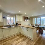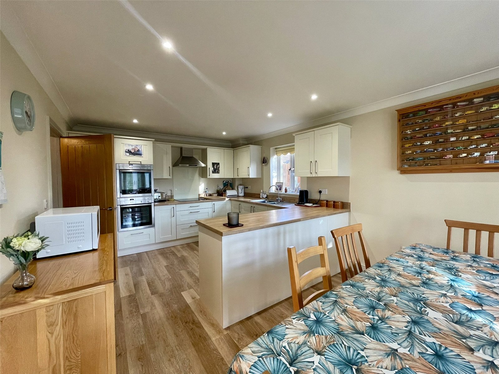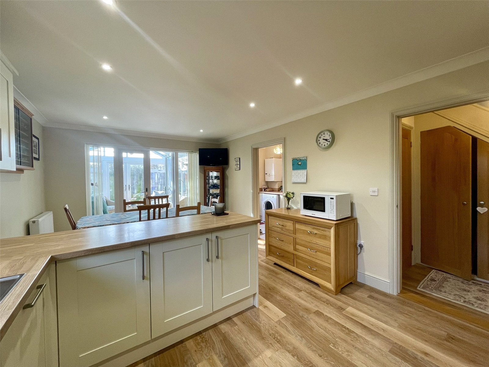 Featuring a range of smart cream fronted units around one half of the space culminating in a peninsular unit separating the dining area whilst retaining togetherness. Woodgrain effect worktop extends across a mix of cupboard and drawer storage options including pan drawers plus integrated dishwasher. Additional appliances include twin eye-level Neff ovens, adjacent four ring hob with brushed steel chimney hood above plus integrated fridge and freezer alongside. Stainless steel single drainer sink unit with drainer bowl and mixer tap. A side window takes advantage of the suns travel from left to right throughout the day along this southerly elevation. From the dining area, French doors with a glazed side panel either side, open to the Conservatory creating more social all-in-one space.