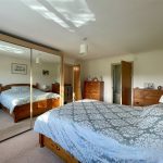 Roomy and with suite comprising vanity wash basin with cupboard beneath, low level wc and P'shape bath with shower over all set off by a tiled floor with complementary tiling. Vertical railed heated towel rail. Light/shaver unit. Window.