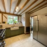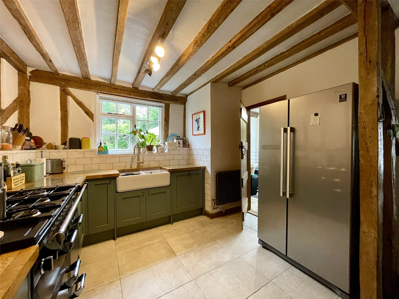 Refitted by the current owners since purchasing in early 2021 and now showing off a smart classic coloured range of units beneath an oak woodblock worktop. Storage includes pan drawers incorporating internal concealed drawers all on 'soft close', pull-out racking and swing out 'kidney' shape corner shelving to cupboards, integrated dishwasher and ceramic twin bowl sink unit with mixer tap complete with pull-out flexi hose. A Rangemaster Leckford 110 Deluxe range cooker will remain. Upright fridge freezer space Classic style column radiator. Exposed timbers. A window provides an outlook to the rear garden.