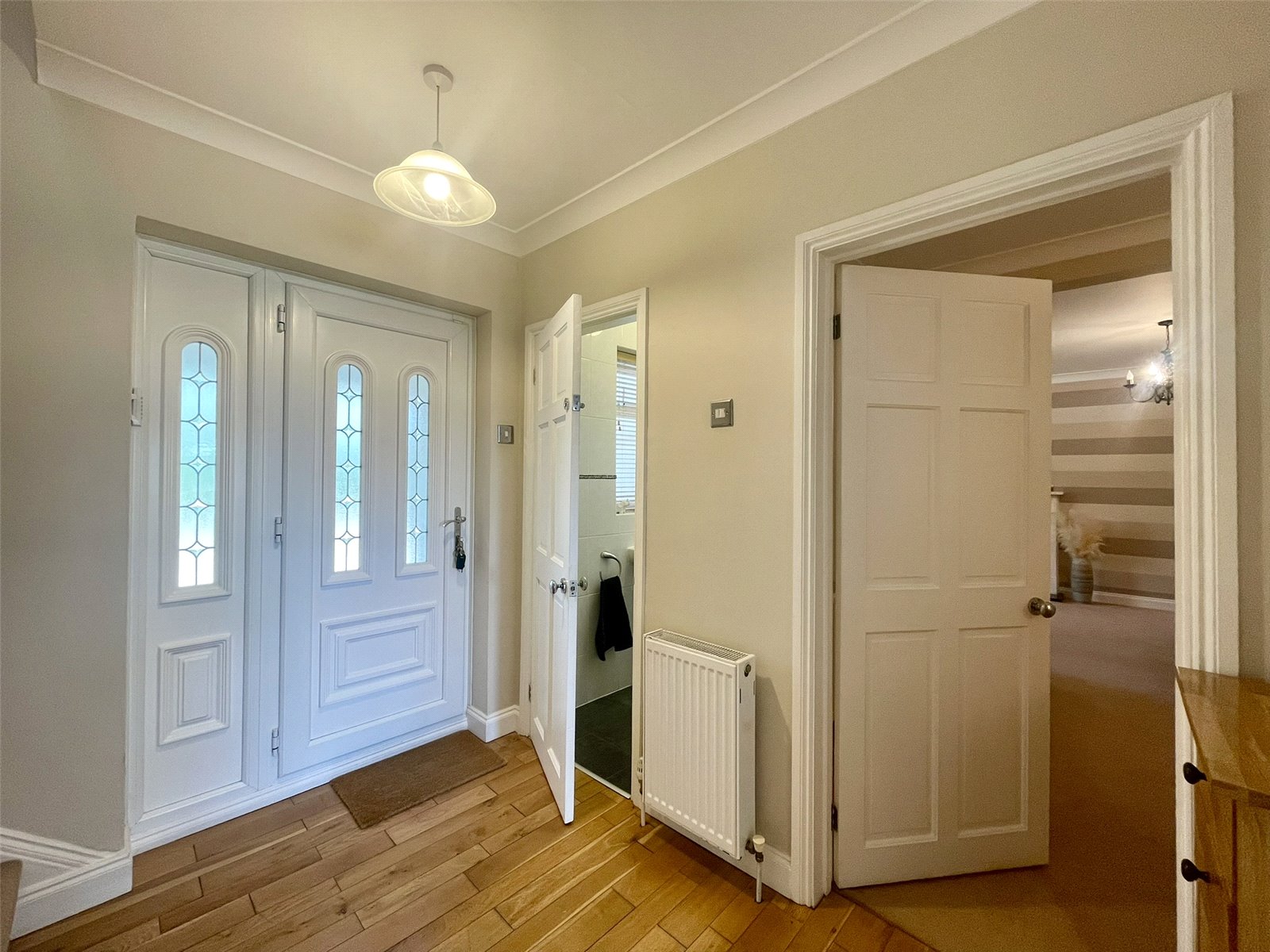 With glazed double opening doors to an initial space and inner 'Front door' with decorative glass panels.