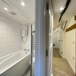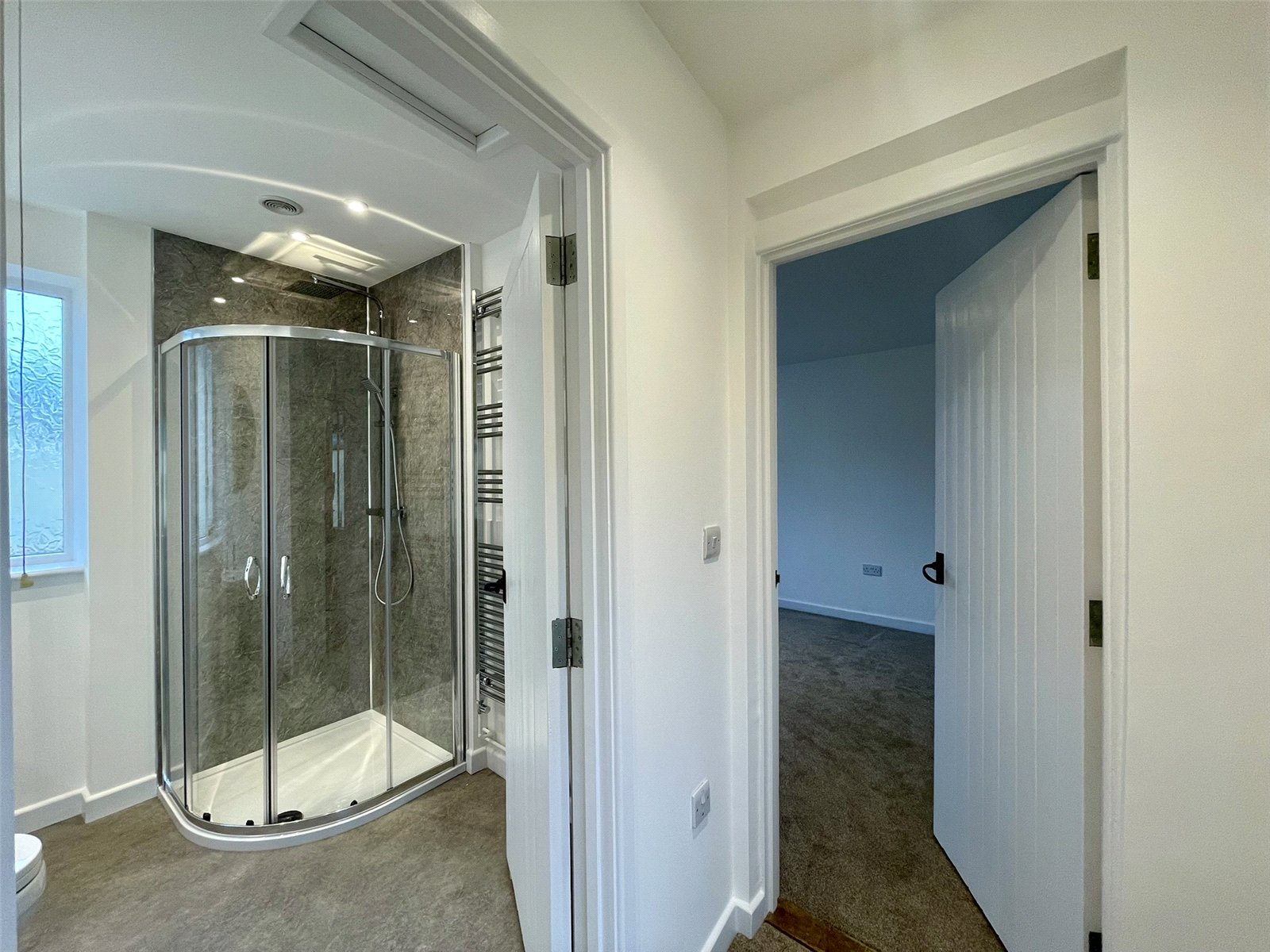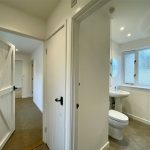 Formerly a bathroom but recently refitted and overhauled to include a new suite comprising pedestal wash basin, low level wc and quadrant shower enclosure. Stainless finish vertical heated towel rail. Window to the side elevation.