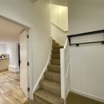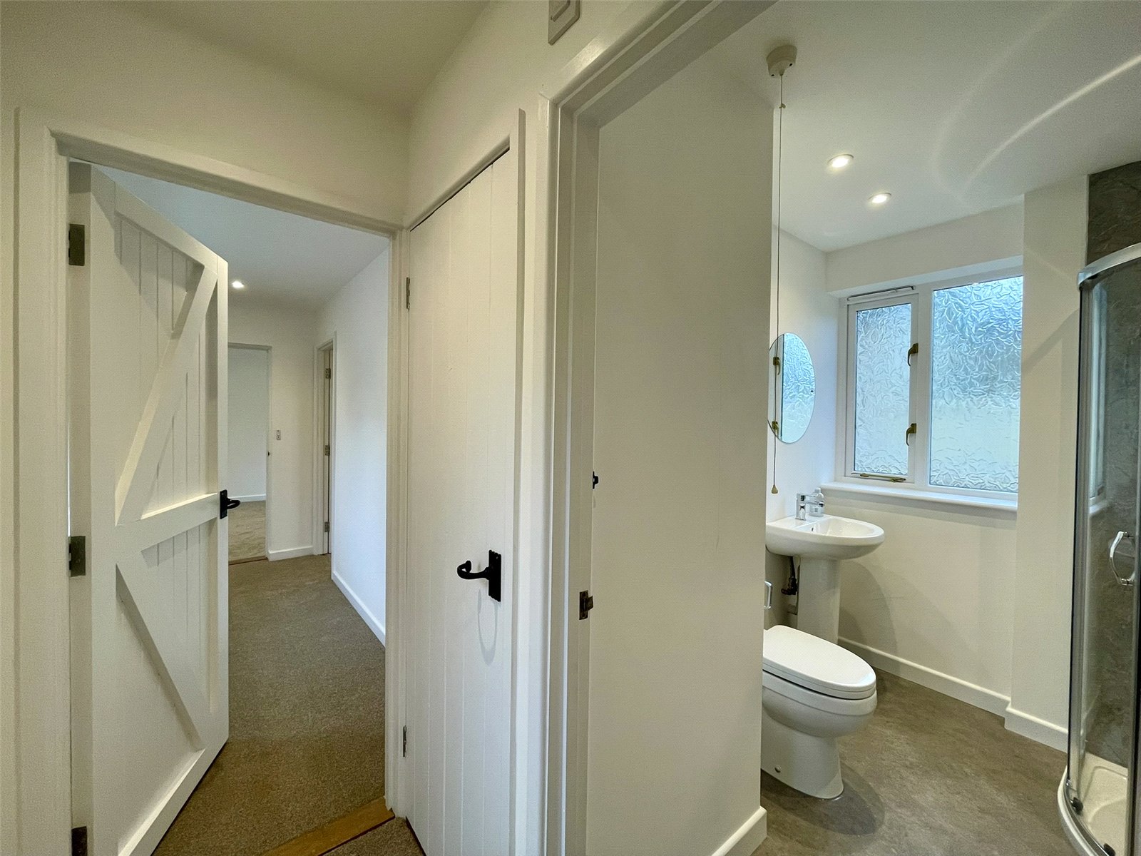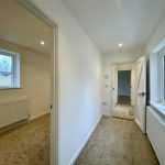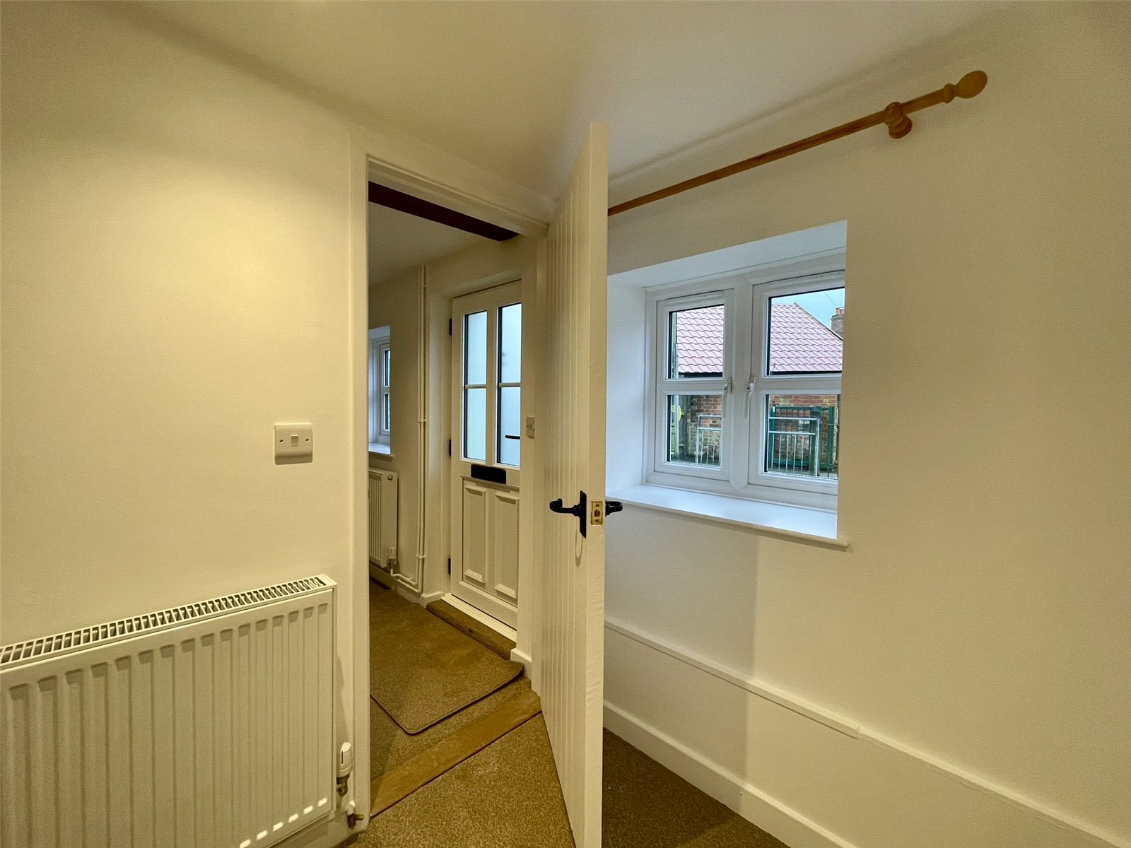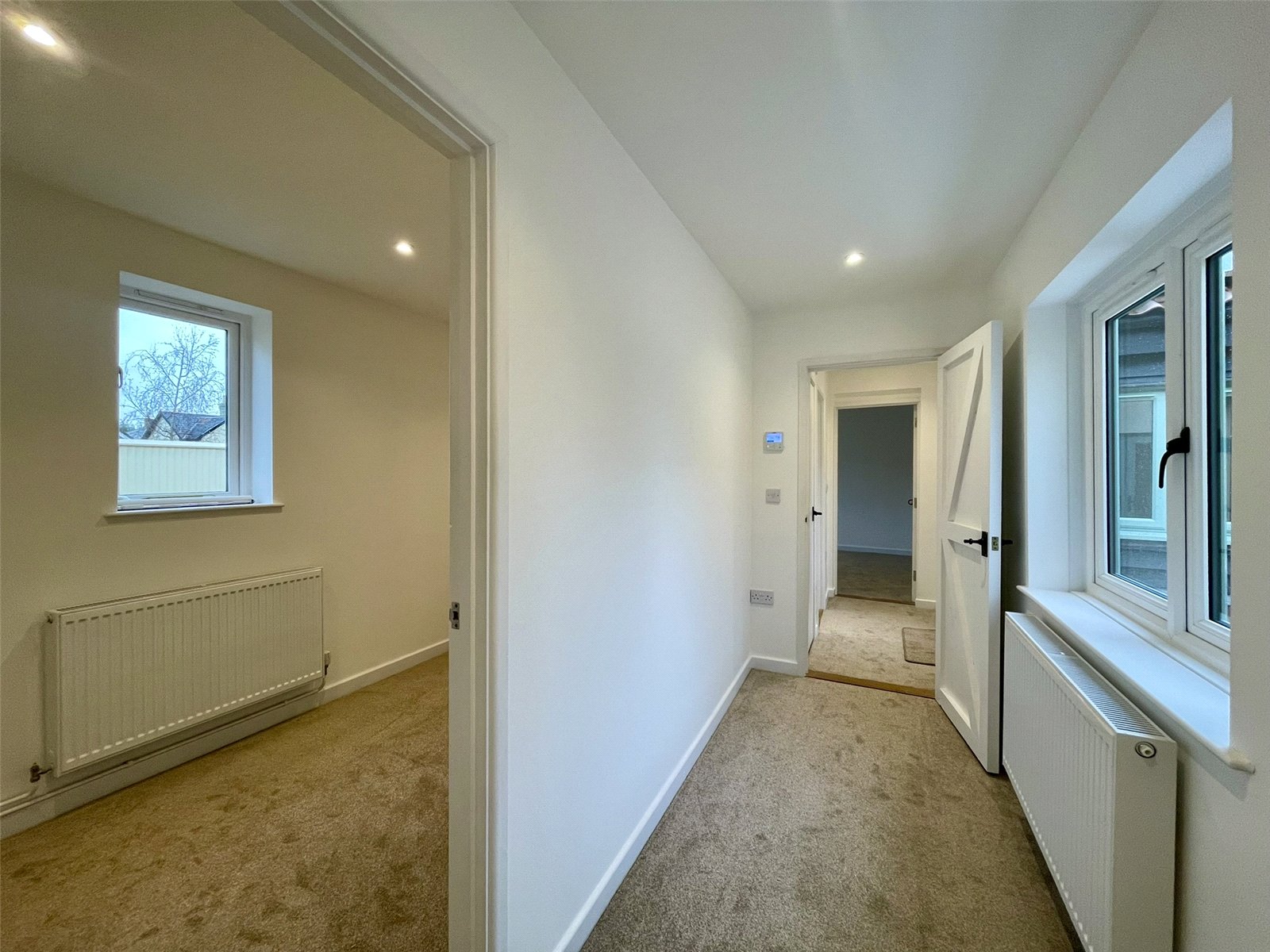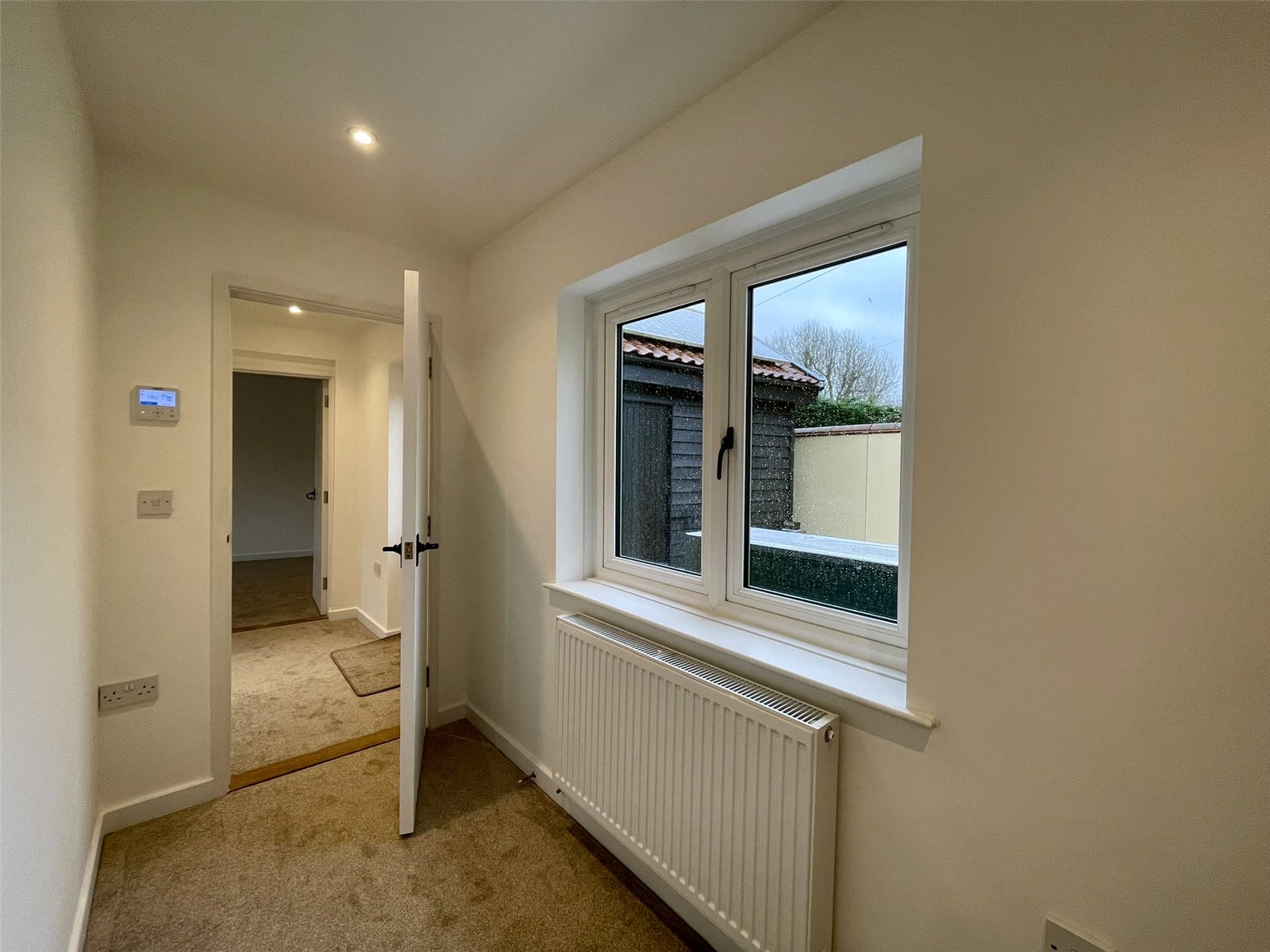 Leading off the main reception room, this two part hall leads through to bedrooms, shower room along with a door out to the courtyard. A side window provides additional natural light. With the 'second' door, one could consider the end bedroom with shower room and outer courtyard door as a suite with independant access (using the garage as access). Cupboard housing Telford Tempest hot water cylinder served by the external Air Source Heat Pump supplying domestic hot water and radiators. Double radiator. Recessed spots.
