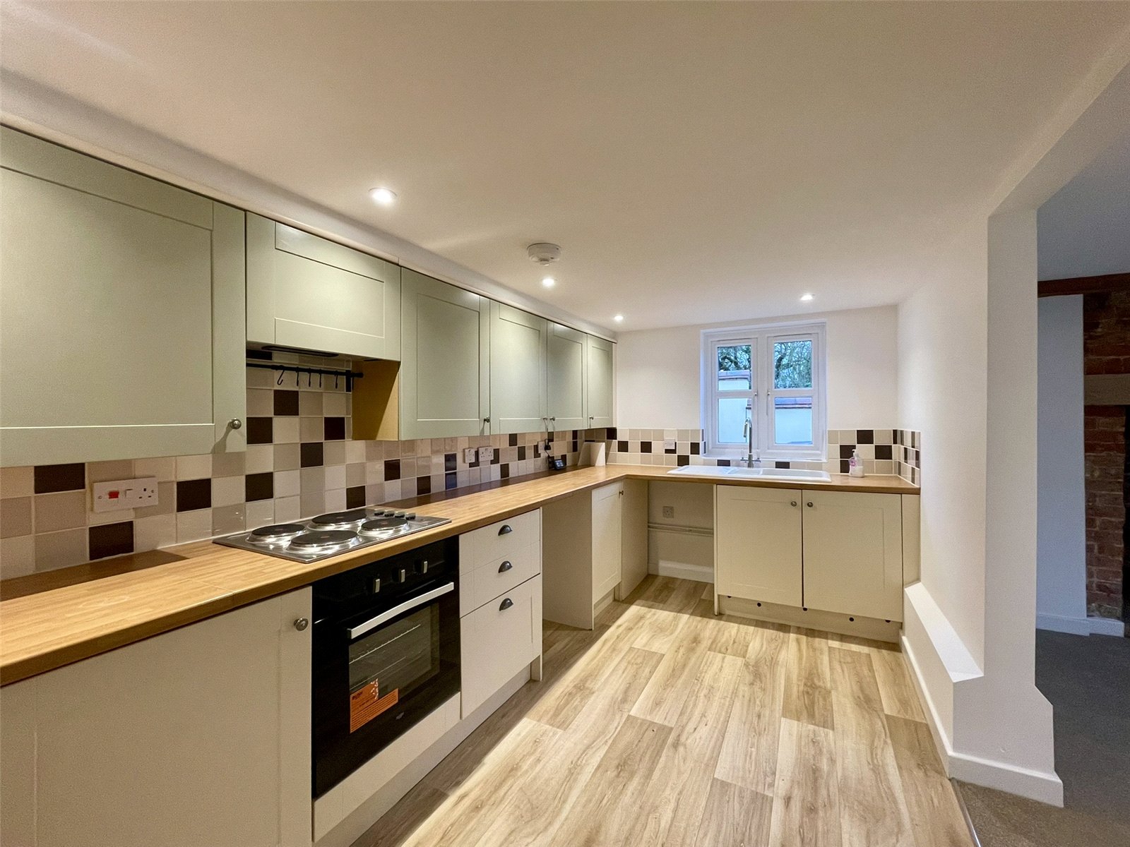 Fitted along the length of the long side with worktop and floor standing storage cupboards and drawers with a row of wall cupboards above. Newly installed electric single oven with four ring hob above plus concealed hood above. Ceramic sink unit with drainer bowl and mixer tap. Tiled splashbacks. Double radiator with thermostatic valve. PVCu double glazed window to the side, above the sink area. An opening connects with the cottage reception room to the front making an ideal...