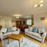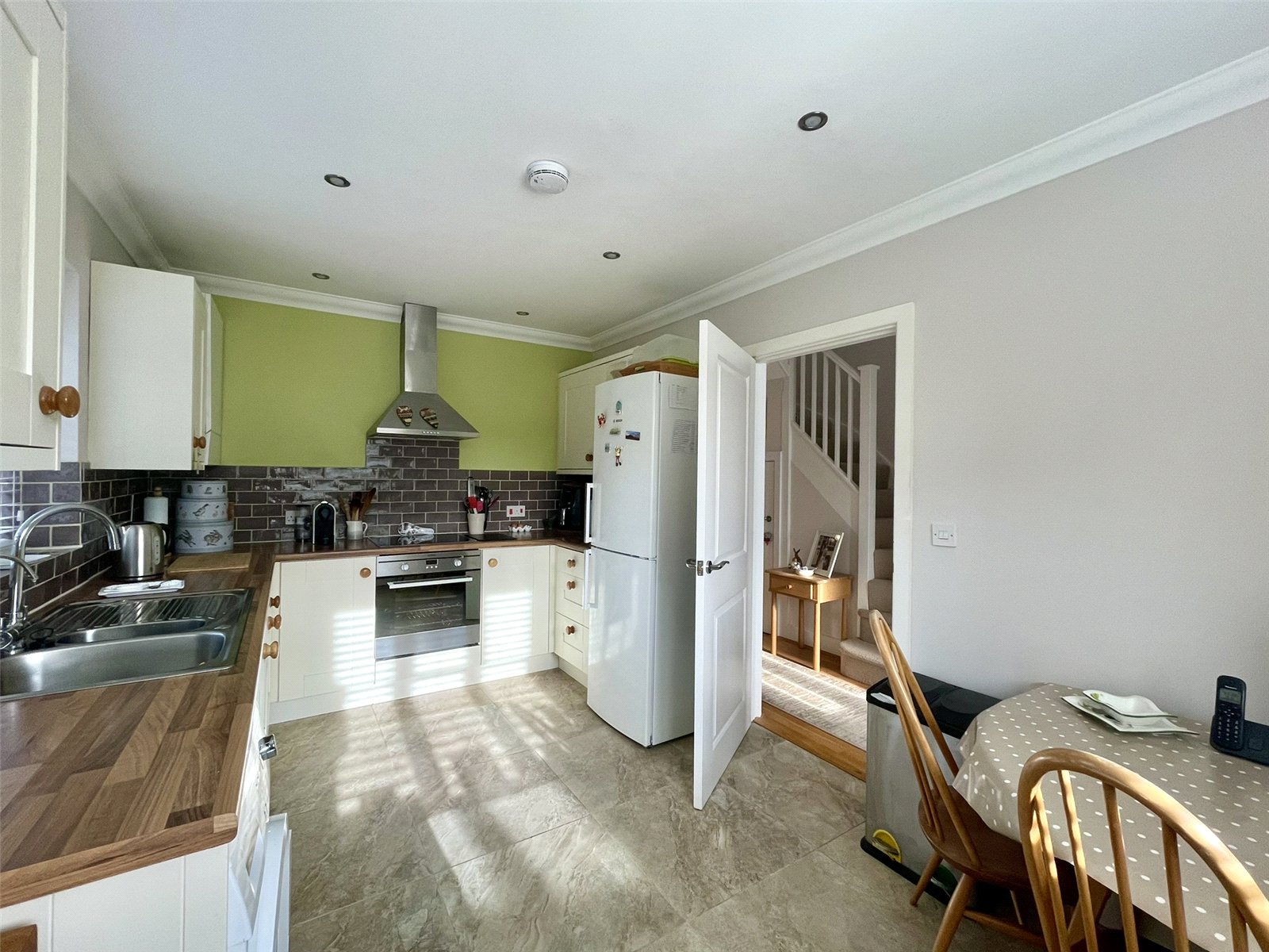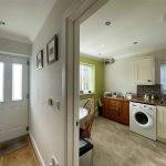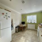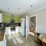 Comfortably providing space for a table and chairs and benefitting from windows within both the front and side elevations. Units to one side incorporate woodblock effect worktop across floor standing cupboard and drawer units including integrated dishwasher, plumbing for washing machine and assorted storage options. Worktop extends around two walls incorporating an Indesit single oven with four ring Induction hob with chimney hood above. To one corner sits the wall mounted oil fired boiler supplying domestic hot water and radiators. Upright fridge freezer space. Clarity installed water softener beneath sink. Double radiator with thermostatic valve. Coved. Recessed ceiling spots. Television and telephone points. Marble flagstone effect flooring.