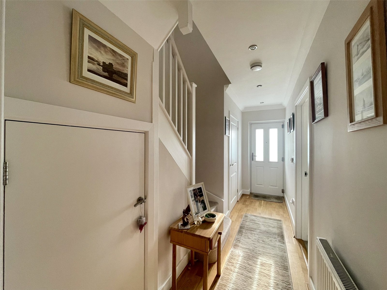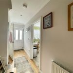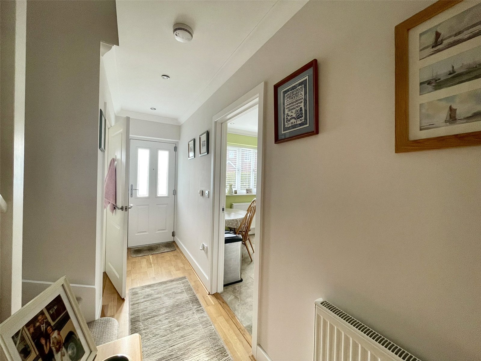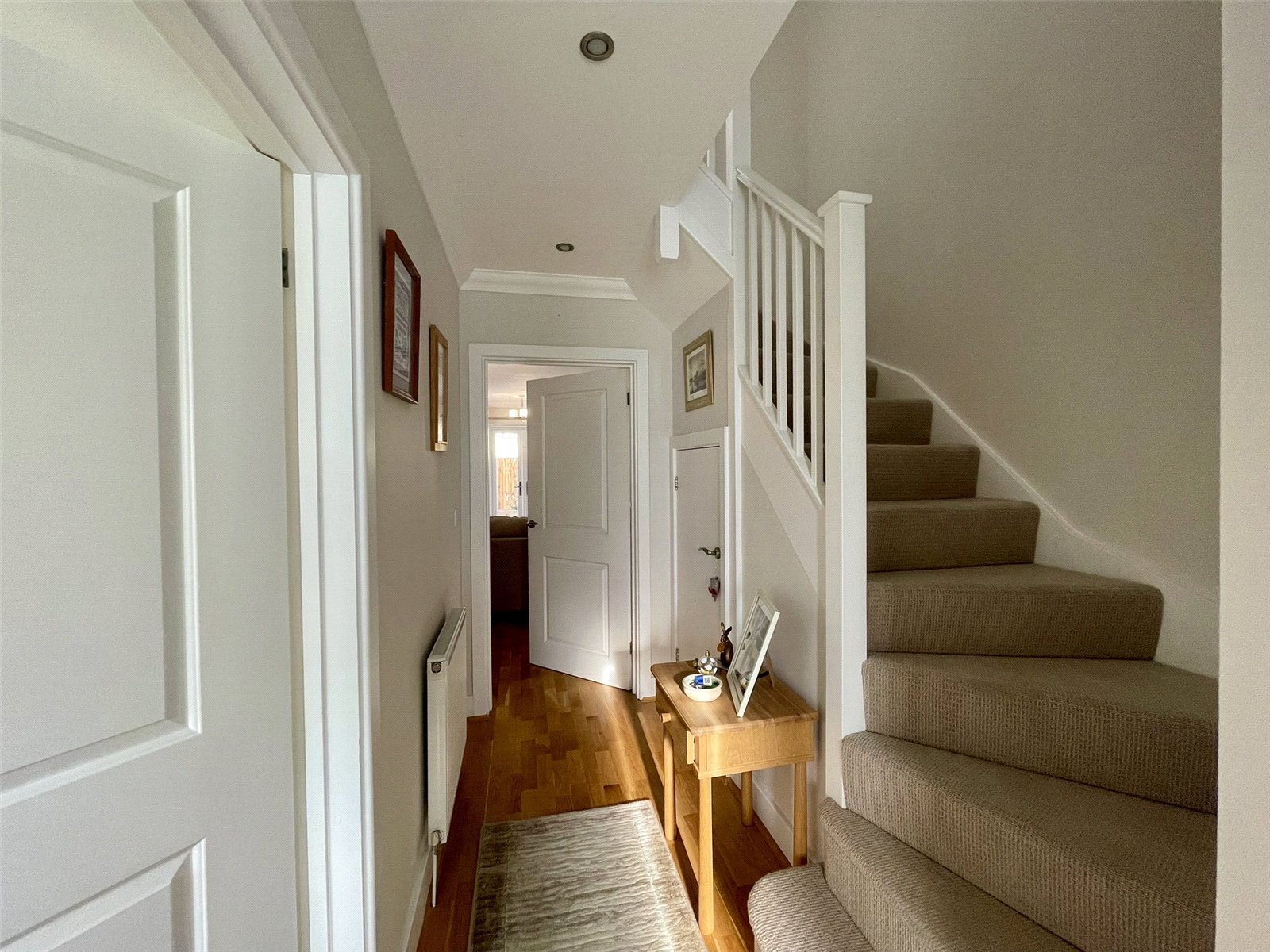 Creating a good first impression, approached via the partly glazed outer door from the canopy porch outside. Inside, a woodblock laminate floor extends through to the main reception room beyond creating a visual flow. To one side the staircase leads up to the first floor and has cupboard beneath. Coving is notable for being of the ogee style along with stylishly plain skirting boards, architraves and doors throughout. Single radiator with thermostatic valve. Wall mounted central heating thermostat.