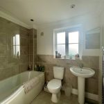 Fitted with a suite comprising p'shape shower bath with shower over, low level wc and pedestal wash basin. Stainless heated towel rail. Extractor fan. Recessed ceiling spots. Marble flagstone effect flooring.
